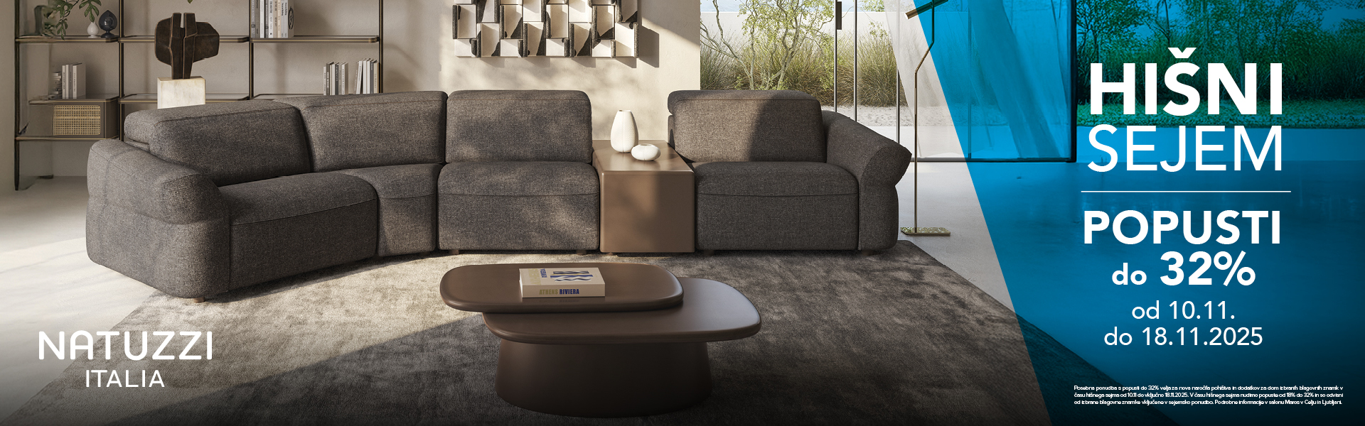 Izredna in časovno omejena ponudba HIŠNI SEJEM se izključuje z ostalo akcijsko ponudbo in velja v dneh od 10.11. do vključno 18.11.2025. Podobne informacije na prodajnih mestih Maros in Natuzzi.