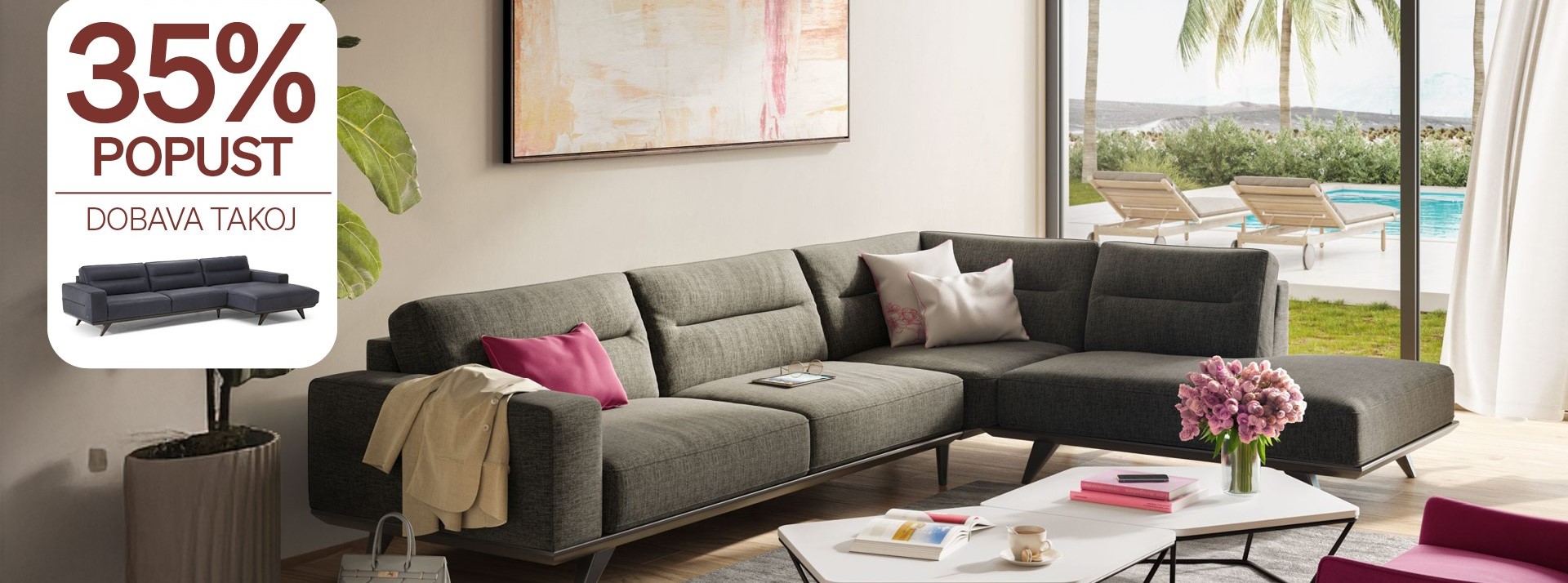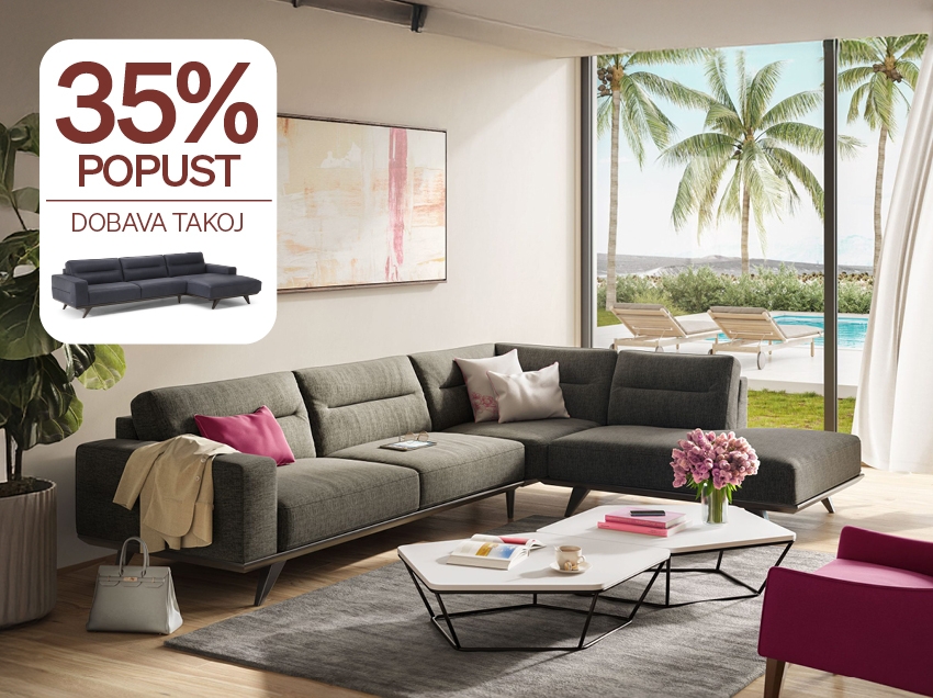Hitra dobava in 35% popust velja na omejeno količino kotnih sestavov sedežne garnitura Adrenalina, ki so na zalogi in sicer od 1.3.2026 do 31.3.2026 oz. do odprodaje. Količina je omejena. Podrobne informacije na prodajnih mestih Maros in Natuzzi v Celju in Ljubljani ali na info@natuzzi.si in info@maros.si