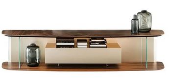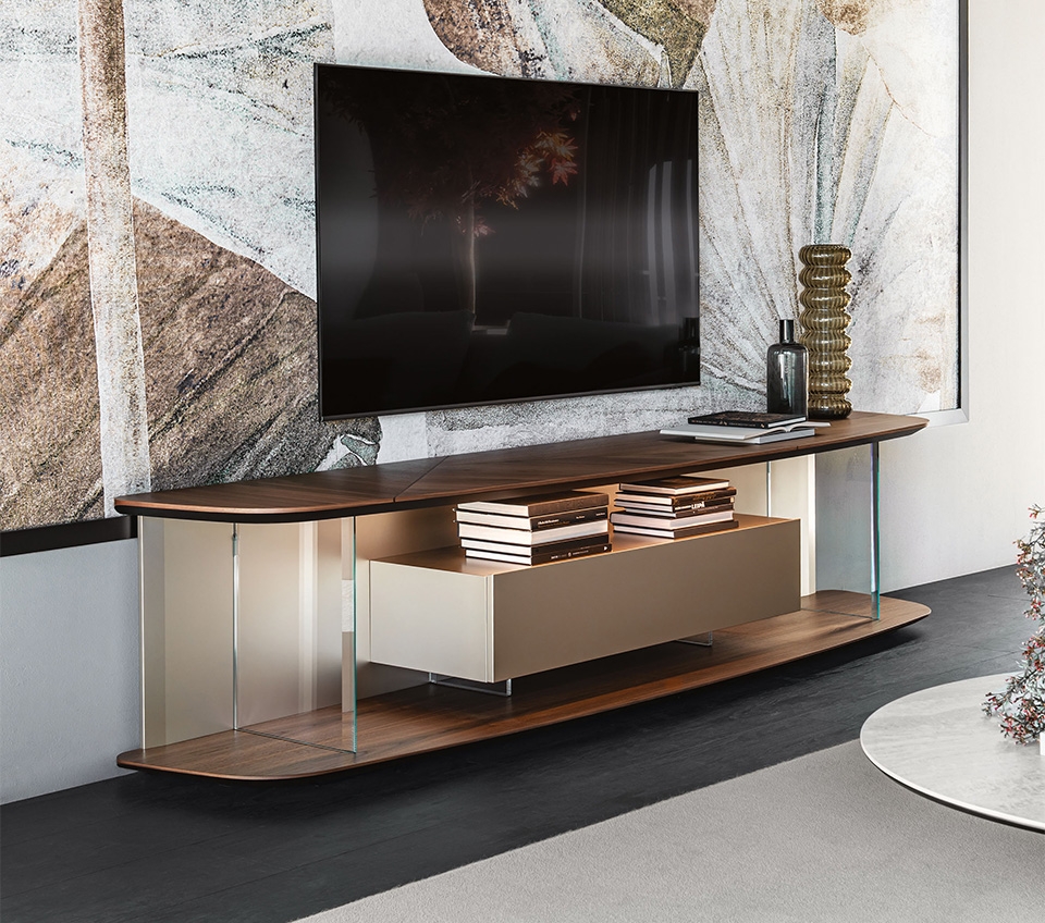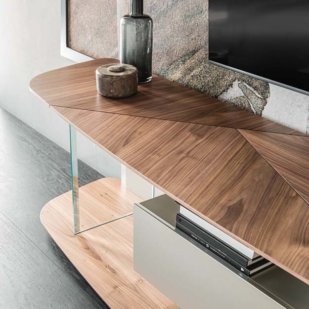 ALTAVISTA je dizajnerska TV omarica, zasnovana za opremljanje velikih prostorov, ne da bi kljub svojim velikodušnim dimenzijam »obtežila« sobo. Ta lahkotnost je dosežena s strokovnim ravnovesjem trdnih in odprtih volumnov, skupaj s široko ukrivljenostjo, zaradi katere se zdi, kot da ta moderna TV omarica brezhibno izhaja iz stene. Kar loči Altavisto od drugih, je lesena plošča, ki je osrednja točka dizajna in je izdelana s prefinjeno igro uravnoteženih spojev in kontrastnim lesenim intarzijskim vložkom, ki poudarja njeno geometrijo. Že na prvi pogled je mogoče opaziti skrbnost in izdelavo, ki stojita za značilno silhueto te lesene TV omarice. Trije materiali, ki se na videz ne povezujejo, se združujejo v popolni harmoniji: plošča in podstavek iz finega lesenega furnirja, prozorne steklene stranice, ki kompoziciji dodajo lahkotnost, ter elegantne kovinske obloge na predalu in odprtem predelku. V tej dizajnerski TV omarici sta estetika in funkcionalnost eno in isto,kar dokazuje odprt predel med ploščo in predalom z vrati, opremljen s priročno vtičnico za kabel in je tudi idealen za shranjevanje vaših elektronskih naprav. Opremljena je z LED osvetlitvijo.