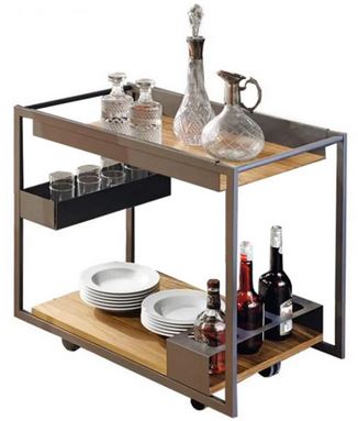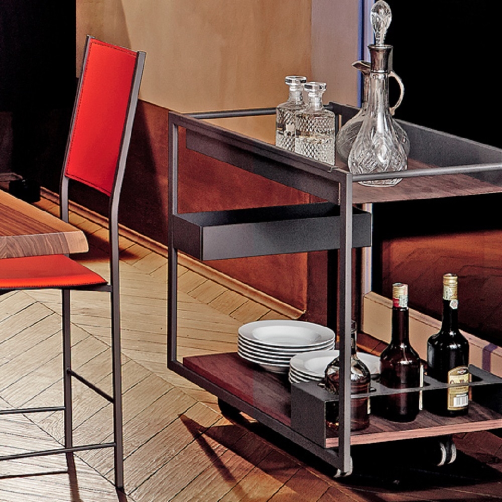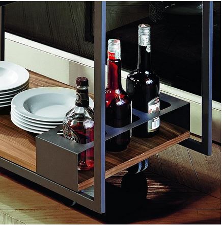 MOJITO WOOD je sodoben voziček z geometrijsko in linearno zasnovo. Dva lesena pladnja podpira eleganten jeklen okvir z minimalistično zasnovo. Dizajnerski voziček je opremljen s predalom za steklenice in praktičnim odprtim predalom polovične višine, oba pa se ujemata z lakiranim grafitnim zaključkom jeklene konstrukcije. Ta voziček ima praktično in skromno velikost. Je eleganten, a sodoben dodatek in vam bo pomagal pozdraviti goste v sodobni dnevni sobi.