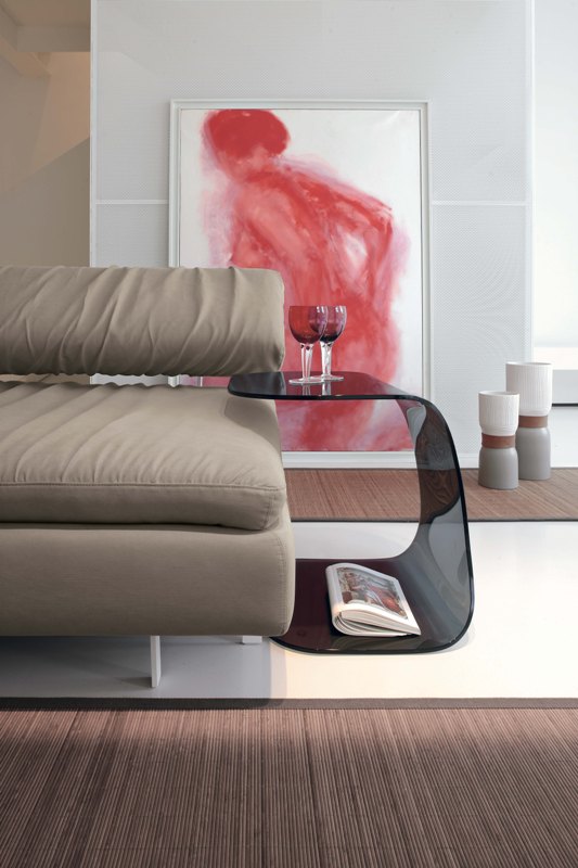 Steklena klubska mizica BESIDE dim. 46 x 50 x h53cm, je na voljo v prozornem ali dimljenem steklu, v levi ali desni obliki.