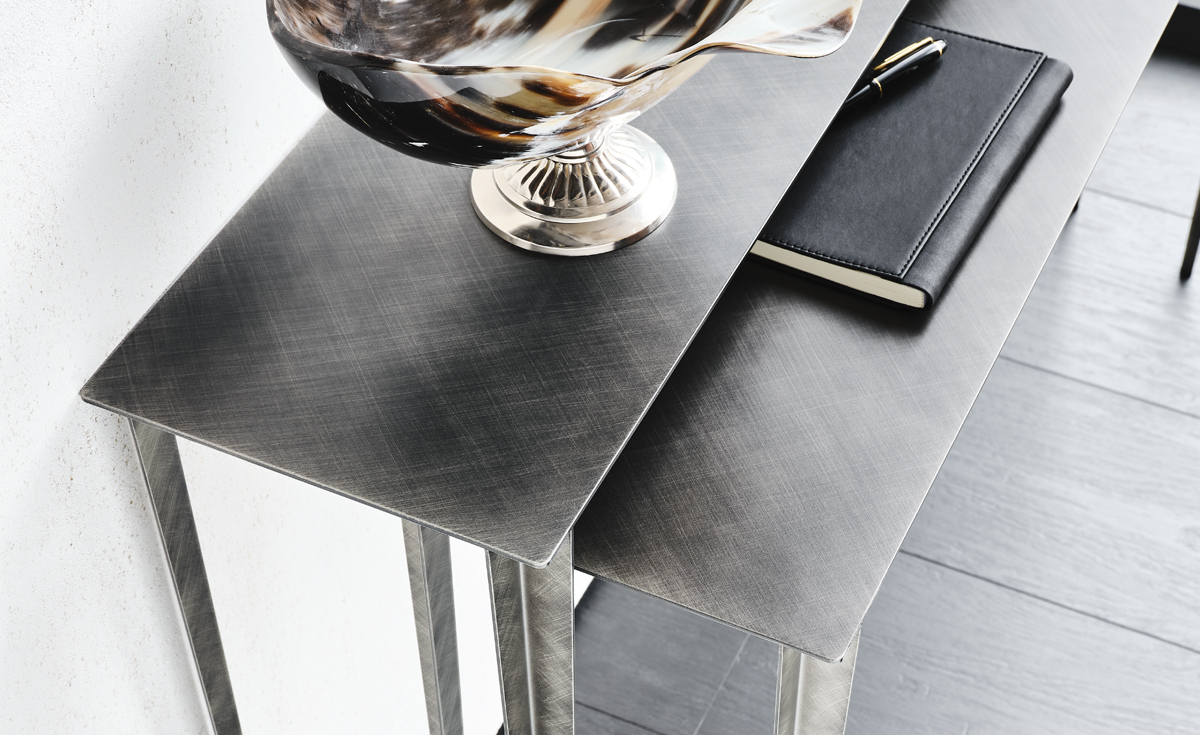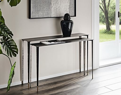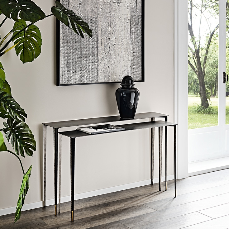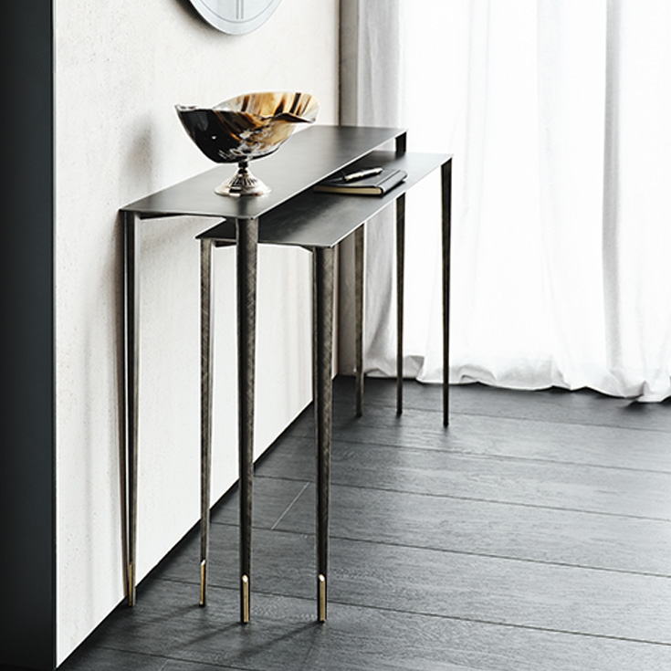 Par konzolnih mizic ETOILE izstopa zaradi svoje elegance in lahkotnosti. Prepleti med vitkimi nogami in dvema visokima zgornjima deloma ustvarjajo koreografski učinek, ki poudarja izvrstne zaključke in medeninaste detajle. Vsak prostor v hiši je okrašen s kontrastom svetlobe in senc, ki ga ustvarja prekrivanje teh modernih konzol.