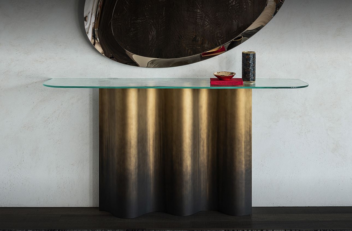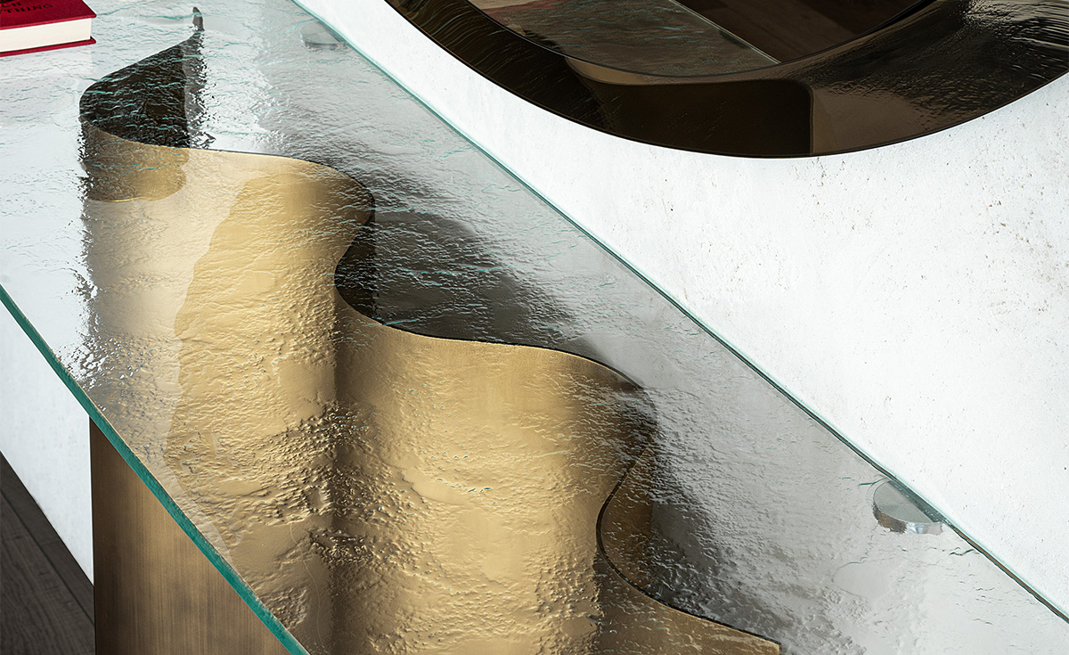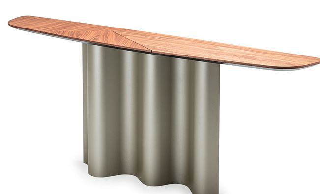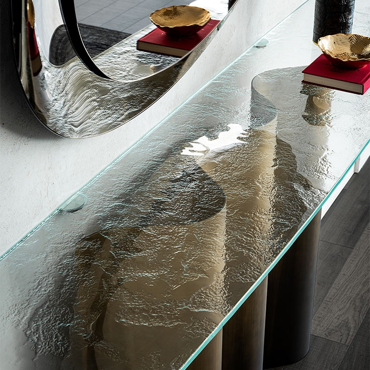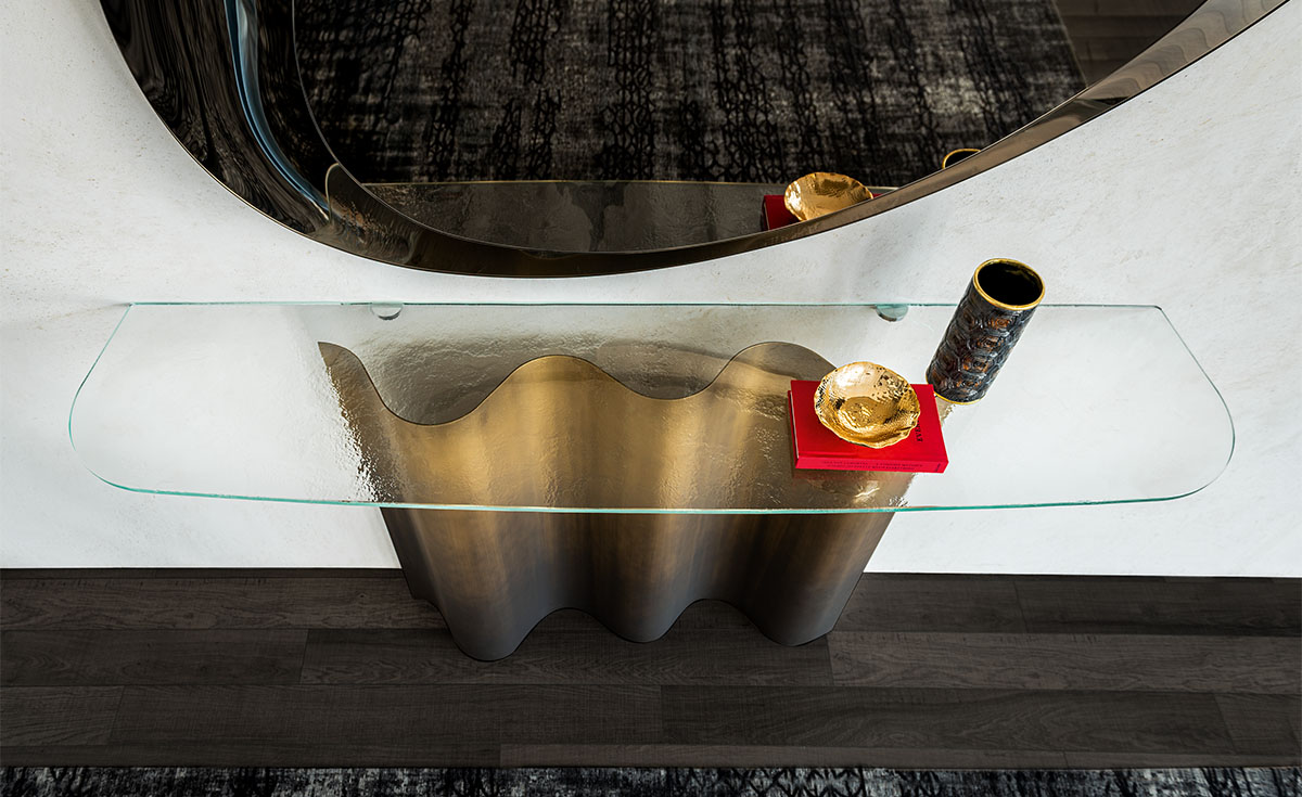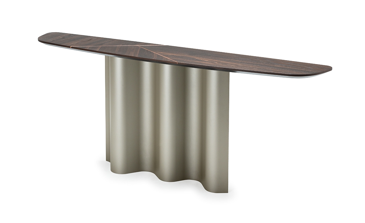 Družina sodobnih konzol NETTUNO je raziskovanje tekočih oblik in mehkih, brezhibnih krivulj. Navdih črpa iz narave, natančneje iz ene od njenih številnih popolnih značilnosti - valov. Njeno vijugasto podnožje je pametno zasnovano tako, da spreminja videz glede na položaj, s katerega ga gledamo. Polni in prazni cilindri zamenjajo mesta s spreminjajočo se svetlobo in senco, ko to dizajnersko konzolo gledamo iz različnih kotov. Zaradi tega je konzola Nettuno hkrati vitka in impozantna, še posebej, če se odločite za okrasitev podnožja s končno obdelavo iz serije Brushed - ročno brušena s strani spretnih obrtnikov. Ukrivljeno kovinsko podnožje je izdelano iz enega kosa, kar še povečuje kakovost te steklene konzole, katere čutno silhueto lahko občudujete v celoti. Različica NETTUNO WOOD je lesena konzola, ki dnevni sobi daje še bolj prestižen čar. Fino izdelan zgornji del ima prefinjeno prepletanje uravnoteženih spojev in kontrastov v leseni intarziji, ki poudarjajo njeno geometrijo.