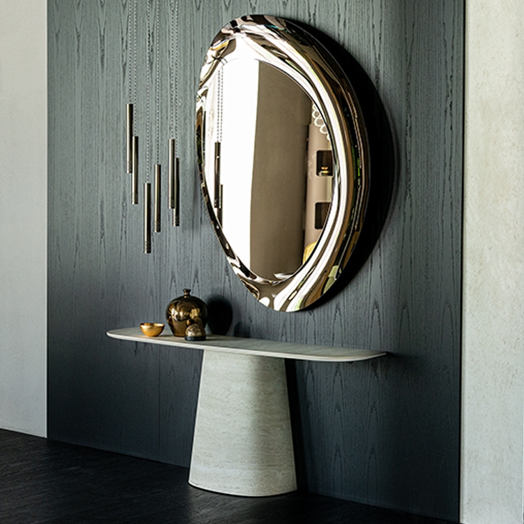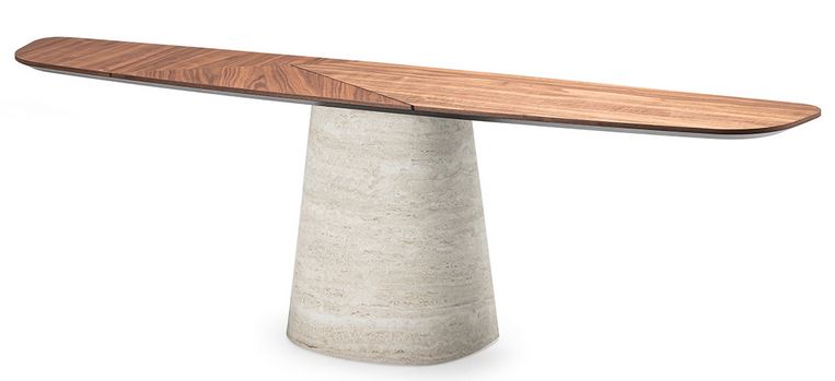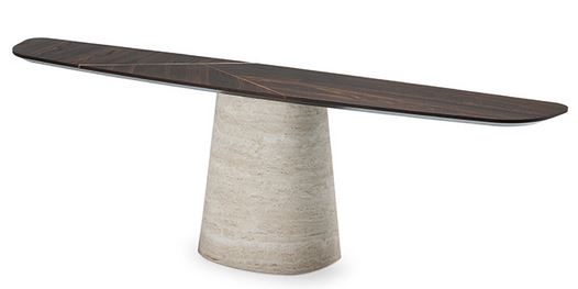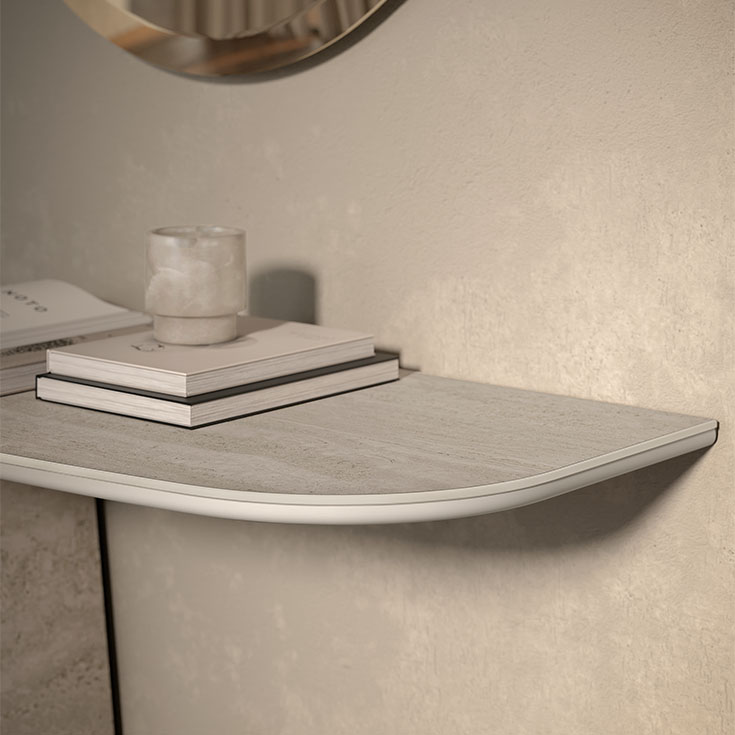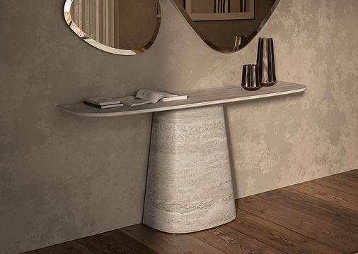 Dizajnerska konzolna miza RADO je utelešenje inovacije na področju modeliranja keramike. Označuje mejo med » prej in potem » v spektru možnih rezultatov, ki jih ponuja ta material, ki je bil prvotno tog in odporen, zdaj pa je vedno bolj prožen, prilagodljiv. To je pravzaprav prvi pojav ukrivljenih plošč v zbirki Keramik, oblikovanih za ustvarjanje podstavkov. Rezultat je sodobna keramična konzolna miza, ki uteleša novo sodobno estetiko in združuje klasične zaključke po navdihu naravnega marmorja z doslej nevidenimi proizvodnimi tehnikami. Za toplejši in prijetnejši videz je na voljo različica RADO WOOD z lesenim zgornjim delom, izdelanim s prefinjeno igro uravnoteženih spojev in kontrastnim lesenim intarzijskim slojem, ki poudarja njeno geometrijo. Na voljo tudi kot okrogla jedilna miza.