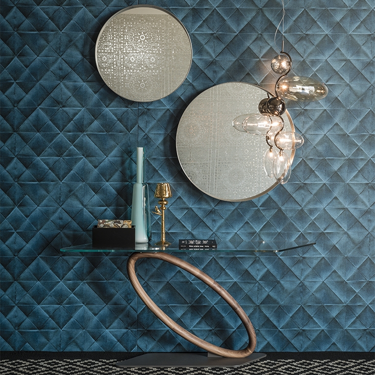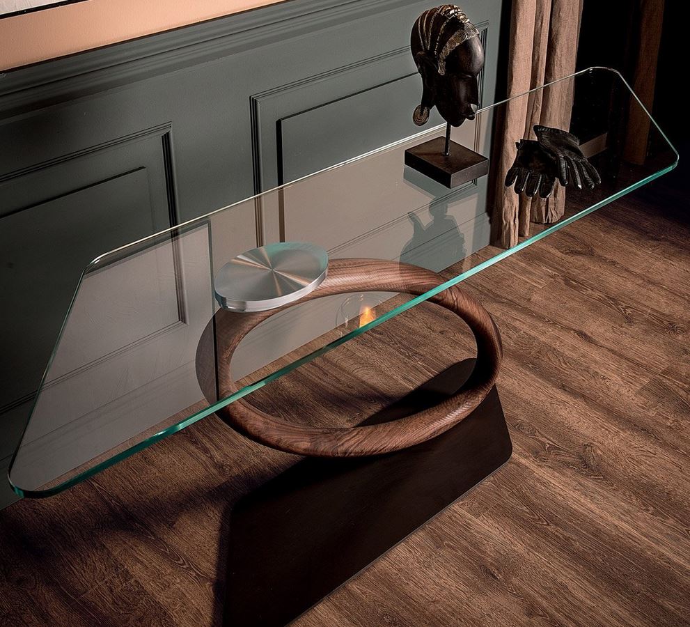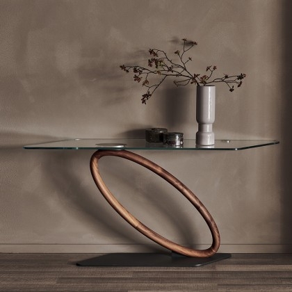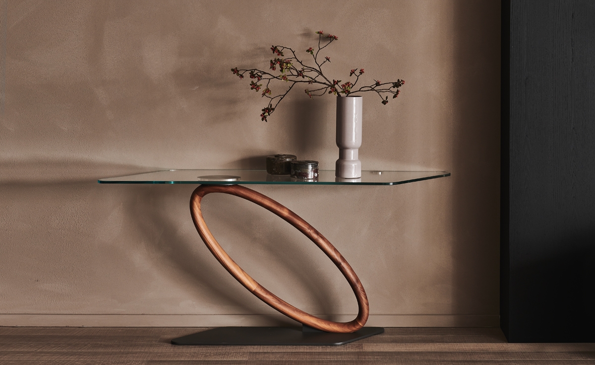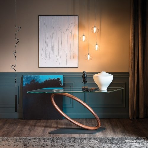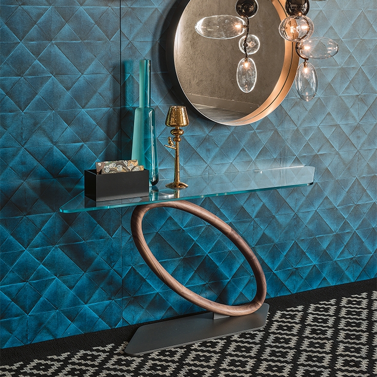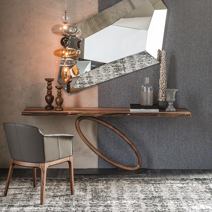 Dizajnerska konzolna mizica TOUR je prefinjen in izviren kos pohištva. Gre za konzolno mizico s stekleno ali leseno mizno ploščo s kiparsko oblikovanim podnožjem, ki bo vašemu domu dala prefinjen pridih. Tour je na voljo z elegantno stekleno mizno ploščo s poševnim rezom ali ploščo iz finega lesa z nepravilnim robom za prijeten naraven učinek. Ta moderna konzola ni le poudarjena s spektakularno zasnovo podnožja, ki ga sestavlja obroč iz masivnega lesa, temveč predvsem s kakovostjo izdelave, materiali in pozornostjo do detajlov, ki je zaščitni znak italijanske proizvodnje.