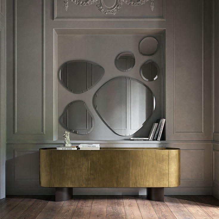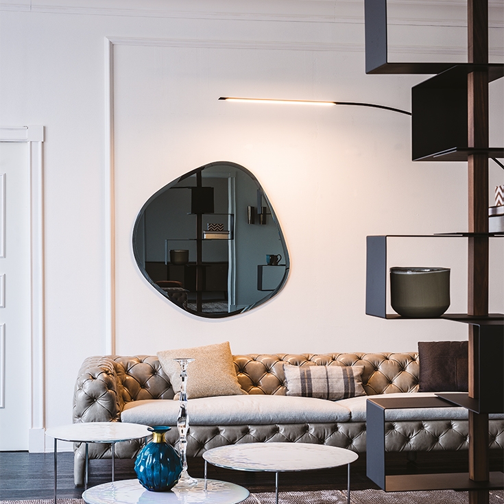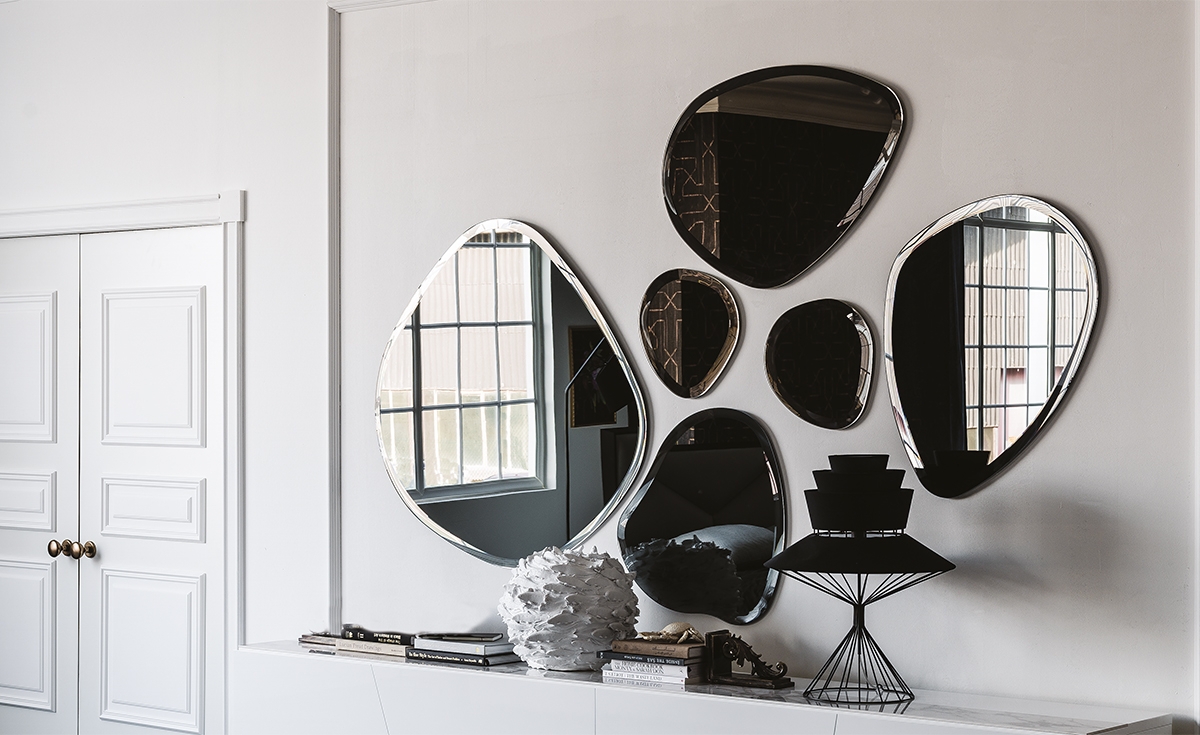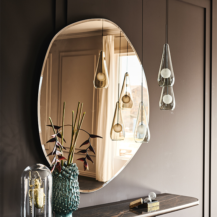 Pet modernih stenskih ogledal, ki spominjajo na pet glavnih otokov rajskega arhipelaga Havajev. Vzemite si trenutek in si predstavljajte, da je vaša stena okrašena z ogledali nepravilnih oblik havajskih otokov, ki spominjajo na neokrnjeno naravo. Nežnost poševnih oblik je združena z odlično kakovostjo zrcalnega stekla, kar ustvarja fascinantno in eksotično dekoracijo. Zrcalni rob je obdelan tako, da doseže prekinjen odsev, s čimer ustvari dobro definiran, a diskreten in nežen okvir. To družino modernih ogledal dopolnjujeta dve večji različici: nepravilno oblikovano ogledalo HAWAII MAGNUM in okroglo ogledalo HAWAII .Ustvarite lahko svojo kompozicijo dizajnerskih ogledal.