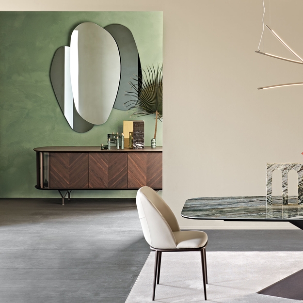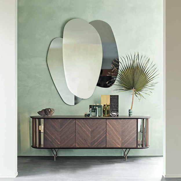 Z modernim ogledalom ULISSE Paolo Cattelan odlično združuje funkcionalnost in dekorativni videz. Gre za ogledalo na treh ravneh, z navpično obliko, ki lepo odraža človeško postavo. Spodnji dve ravni sta iz dekorativnega dimljenega zrcalnega stekla in obdajata zgornjo raven zrcala.Z nežnimi nepravilnimi krivuljami, ki objemajo prostor, ogledalo Ulisse elegantno okrasi tako bolj družabna okolja kot tudi bolj intimna in zasebna.
