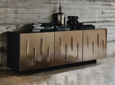 Dizajnerska komoda CARNABY ima izjemen, prefinjen dizajn. Oblika vrat daje strukturi komode značaj in ritem. Fronte so izdelane iz izbočenega zrcalnega stekla v bronastem ali zadimljenem steklu, zahvaljujoč spretni tehniki izdelave. Komoda Carnaby odseva njeno okolje z nadrealističnim zrcalnim učinkom. Dragoceni materiali, ki sestavljajo njeno celoto, poudarjajo, da je ta sodobna steklena omarica rezultat visoko kakovostne italijanske proizvodnje. Na voljo je opcija izbire notranjega predala.