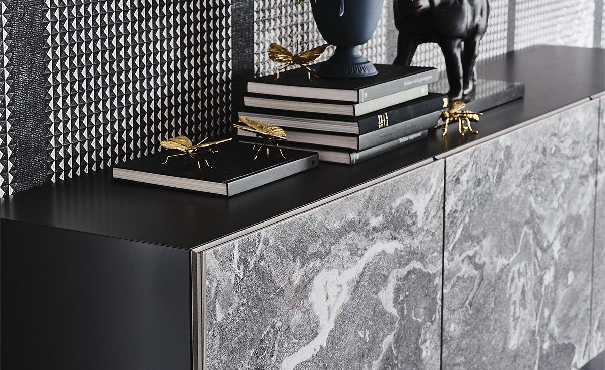 Namen komode METROPOL je, da v vaš interier vnese eleganco z njenim minimalističnim dizajnom. Pozornost bo pritegnila v dizajnerskih restavracijah in hotelih.To moderno omarico poudarja dragocen zaključek vrat iz keramike v vzorcu marmorja, ki je na voljo v več prefinjenih odtenkih. Opremljena je s prozornimi steklenimi notranjimi policami, ki so idealne za shranjevanje najdragocenejših predmetov. Vrhnjo pokrivno ploščo komode lahko izbirate v bronastem ogledalu ali kaljenem steklu različnih odtenkov.