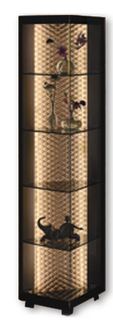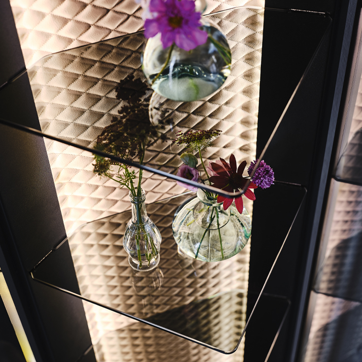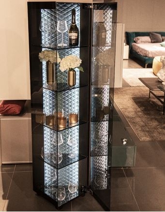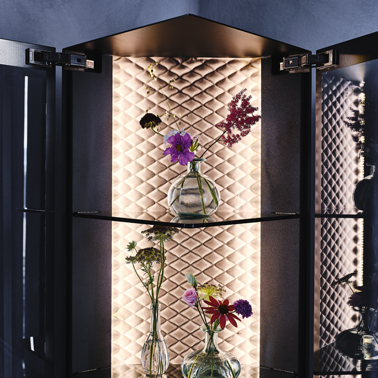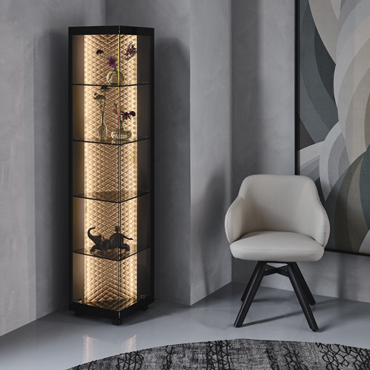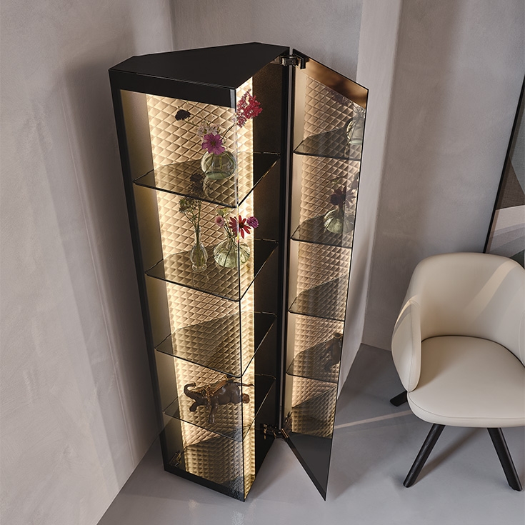 Vitrina za dnevno sobo ATELIER, kljub skromni velikosti obogati prostor z močnim vizualnim učinkom. Zahvaljujoč trikotnemu prerezu lahko elegantno okrasi kotiček sobe. Lahko pa to moderno vitrino za dnevno sobo postavite tudi ob steno, da spodbudite radovednost s štrlečim osrednjim steklenim robom. Notranjost te elegantne vitrine iz dimljenega stekla je prekrita z usnjem ali sintetičnim usnjem, okrašena z izvrstnim diamantnim prešitjem. LED osvetlitev, ki poteka navpično vzdolž notranjega hrbtnega dela, poudarja tako Couture krojenje kot tudi odseve kristala in predmetov, skrbno razporejenih v notranjosti.