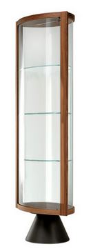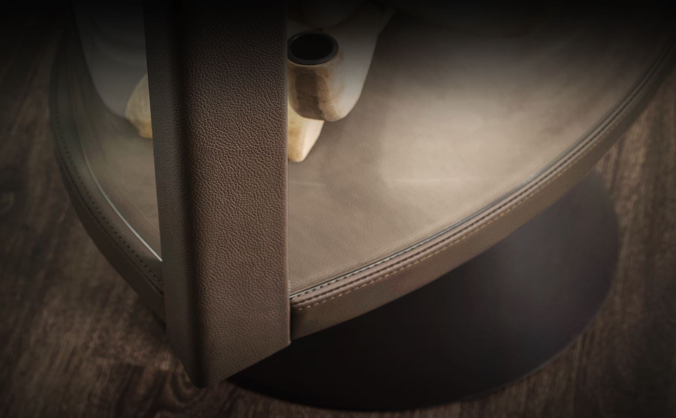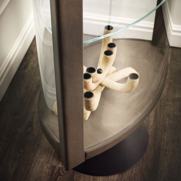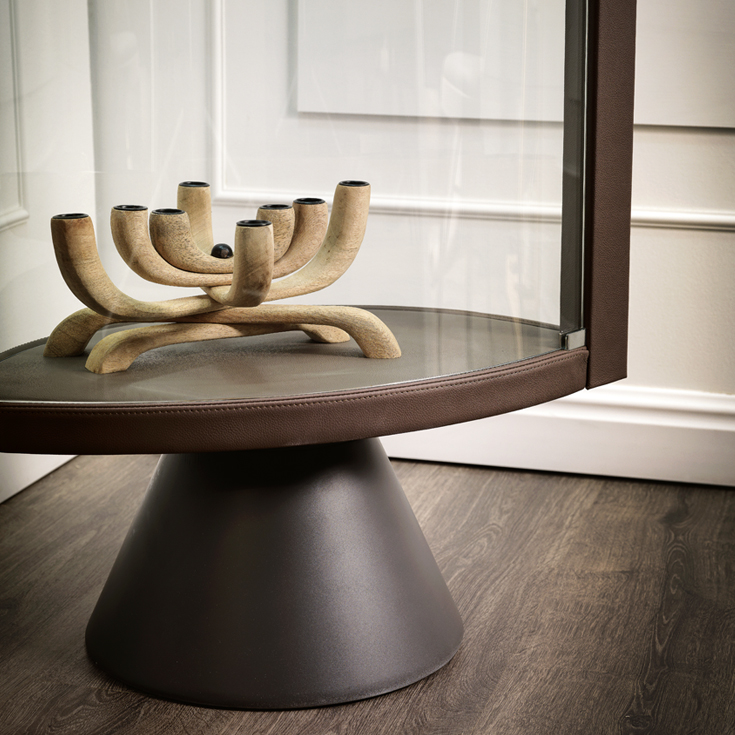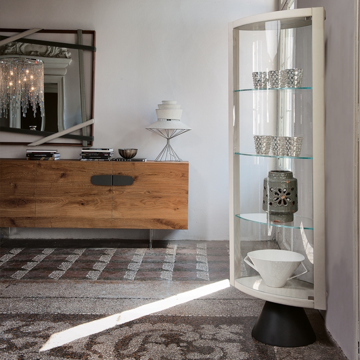 Moderna vitrina SABA je dragoceno in elegantno dopolnilo k opremljanju. Ta steklena omarica s posebnim slogom se ponaša s kombinacijo strokovno uravnoteženih materialov. Jekleno podnožje je osrednja točka vrtljive konstrukcije, prevlečene s finim usnjem. Vrata in police so izdelane iz dragocenega, izjemno prozornega stekla. Dvokrilni lok ni simetričen, kar tej vrtljivi stekleni vitrini daje izviren slog.