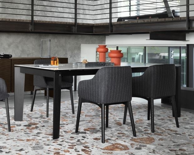 Raztegljiva miza ALPHA je popolnoma usklajena z idejo funcionalnih, elegantnih in vsestranskih kosov pohištva, ki poskrbijo za vse običajne »spremenljivke« živahnega doma in naredijo vsakdanje življenje enostavnejše in prijetnejše. Rahlo zožene noge zagotavljajo največje udobje za goste, ki sedijo za mizo. Njena zasnova je vsestranska zaradi kombinacije masivnih lesenih nog in izbire med več keramičnimi miznimi ploščami. Podaljški so nameščeni na okvir z vodenim odpiranjem, ki mizo podaljšajo.