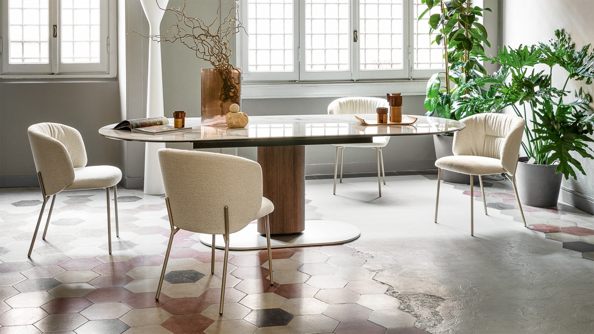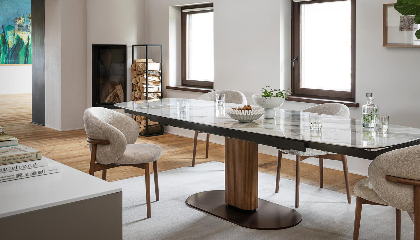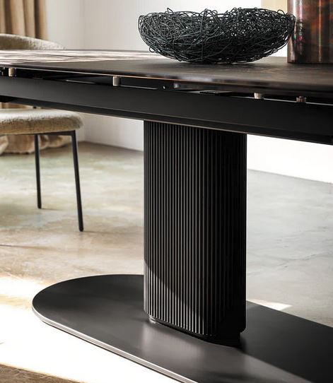 CAMEO je mojstrovina modernega italijanskega pohištva, zasnovana tako, da v vaš jedilni prostor vnese eleganco in funkcionalnost. Z značilno ovalno površino in drznim podnožjem ta miza ustvarja eleganten vtis, hkrati pa zagotavlja stabilnost in udobje. Miza Cameo ima centralno nogo na ovalnem podstavku. Celotno podnožje mize je izdelano iz lakirane kovine, pri čemer lahko izbirate različne barve, tako stebra kot spodnje plošče. Izbira stebra v rebrasto oblikovanem furnirju je še posebno bogata izvedba. Zgornja mizna plošča, vključno s podaljški, je iz keramike. Zaradi možnosti kombiniranja med hladnimi in toplimi barvami, skupaj z igrivostjo marmornih površin je izredno elegantna in moderna miza. Na voljo tudi fiksna jedilna miza Cameo z leseno mizno ploščo v hrastu različnih odtenkov in v fiksni ali raztegljivi različici.