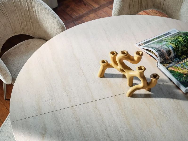 Keramični mizni podaljšek se skriva v sredinskem delu, pod mizno ploščo. Z rahlim potegom – odmikom leve in desne polovice mizne plošče, bo vaša jedilna miza pripravljena za sprejem nenapovedanega obiska.