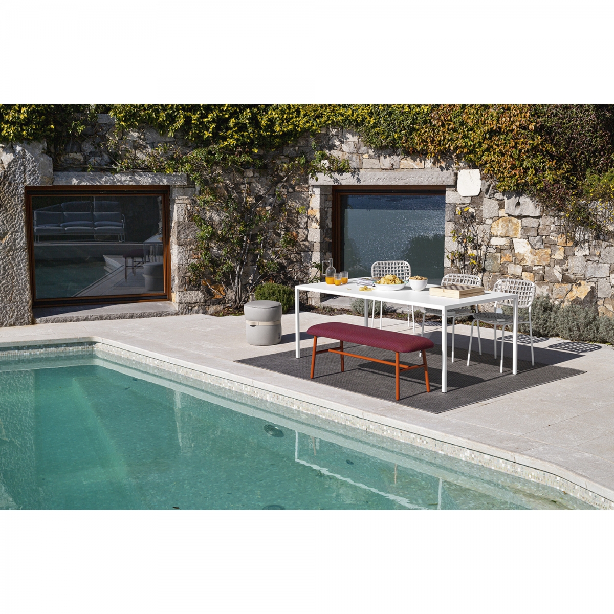 Jedilna miza IRON ima skromen dizajn s preprosto, tanko pravokotno mizno ploščo iz trdne kovine, ki jo dopolnjujejo vitke kvadratne profilirane noge, katere se elegantno stikajo z vogali. Njena vitka silhueta je v celoti iz kovine in primerna za zunanjo uporabo, saj je odporna na zunanje vplive. Izberite jo v črni ali beli izvedbi.