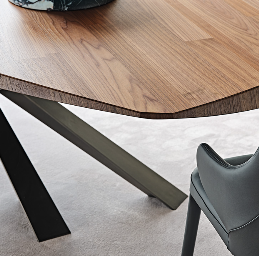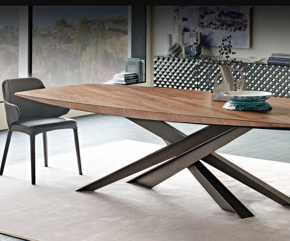 Štiri »rezila« v podnožju režejo zrak in se sekajo, kar ustvarja energijsko kompozicijo z videzom neponovljivega vzorca. Vsaka noga je zasnovana s T-prerezom, kar pomnoži možnosti za križanje in prekrivanje. Ta kombinacija ustvarja ritmičen kontrast, kjer prazna območja izzvenijo, medtem ko so kovinski deli izrazito poudarjeni. Drzna estetika, ki se ne boji pritegniti pozornosti, se razteza na več različic jedilnih miz Lancer. Standardni model LANCER je izdelan iz prozornega, kaljenega stekla, kar vam omogoča, da lahko skozi mizno ploščo občudujete kiparsko podlago v celoti. Model LANCER MONOGLASS je sodobno okrašena steklena miza s tridimenzionalnim bronastim zaključkom, ki jo odlikuje nepravilna tekstura, ki si jo je oblikovalec zamislil kot planet, ki ga je potrebno raziskati. LANCER KERAMIK in LANCER WOOD, kjer prva vključuje keramično ploščo z vzorcem marmorja, medtem ko druga ponuja dragocen leseni vrh. LANCER MASTER WOOD z mizni ploščo, oplemeniteno iz vrhunskega lesa, katerega robovi so spretno obdelani z ostrim očesom za podrobnosti.