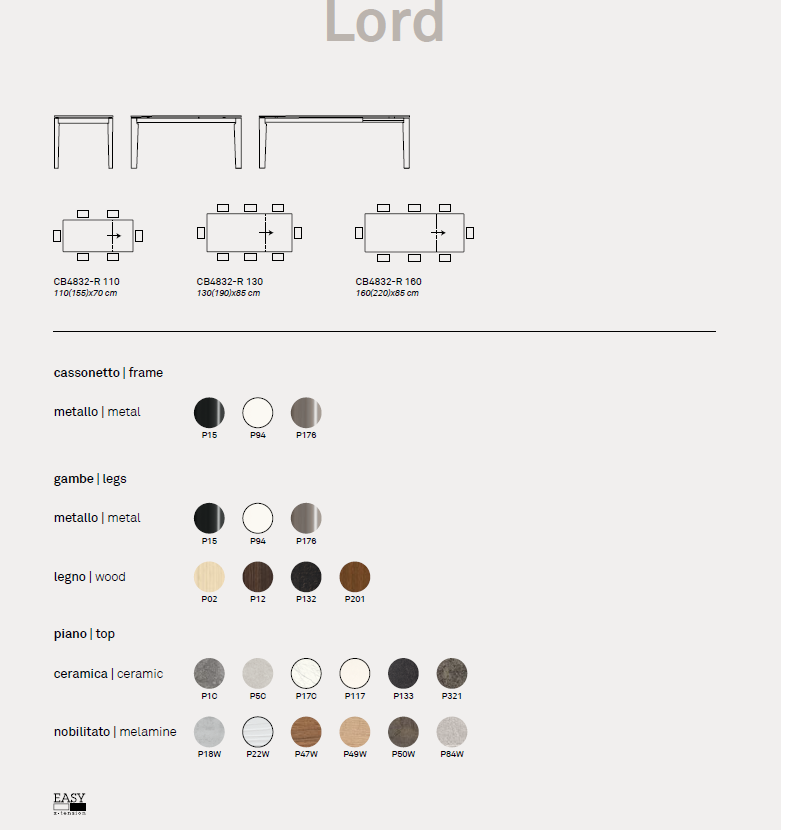 Izjemno elegantna jedilna miza LORD ima podnožje oblikovano z eliptičnim prerezom in na notranji strani zoženimi stranicami iz lesa ali kovine. Praktični mizni podaljški so nameščeni na okvir z vodenim odpiranjem, ki mizo podaljšajo. Podaljški drsijo vzdolž skritih drsnikov in omogočajo enostavno odpiranje. Mizna plošča ima velik izbor vzorcev keramike in melamina, katero enostavno kombinirate z izborom podnožja.