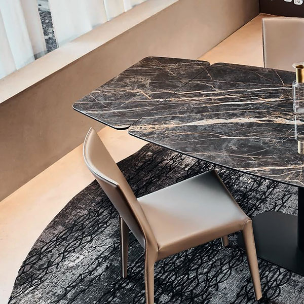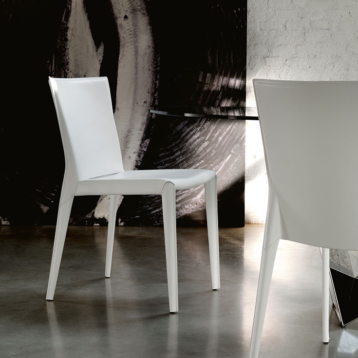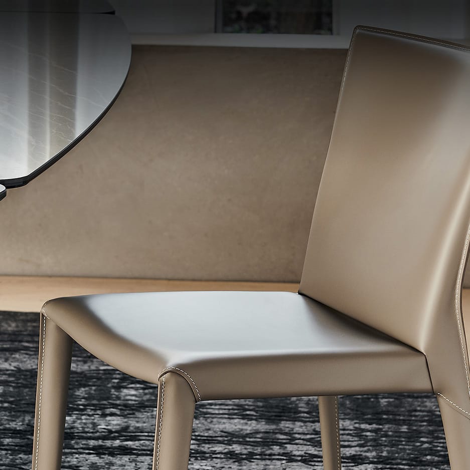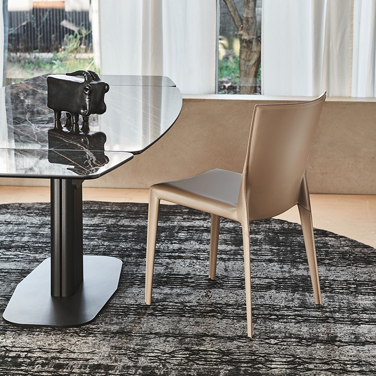 Kakovost italijanske izdelave je opazna v vidnih šivih, ki se ujemajo z oblazinjenjem, in v natančno izrisanih linijah naslonjala. Na voljo je v široki paleti finega usnjenega oblazinjenja.