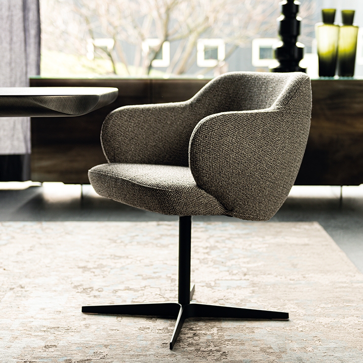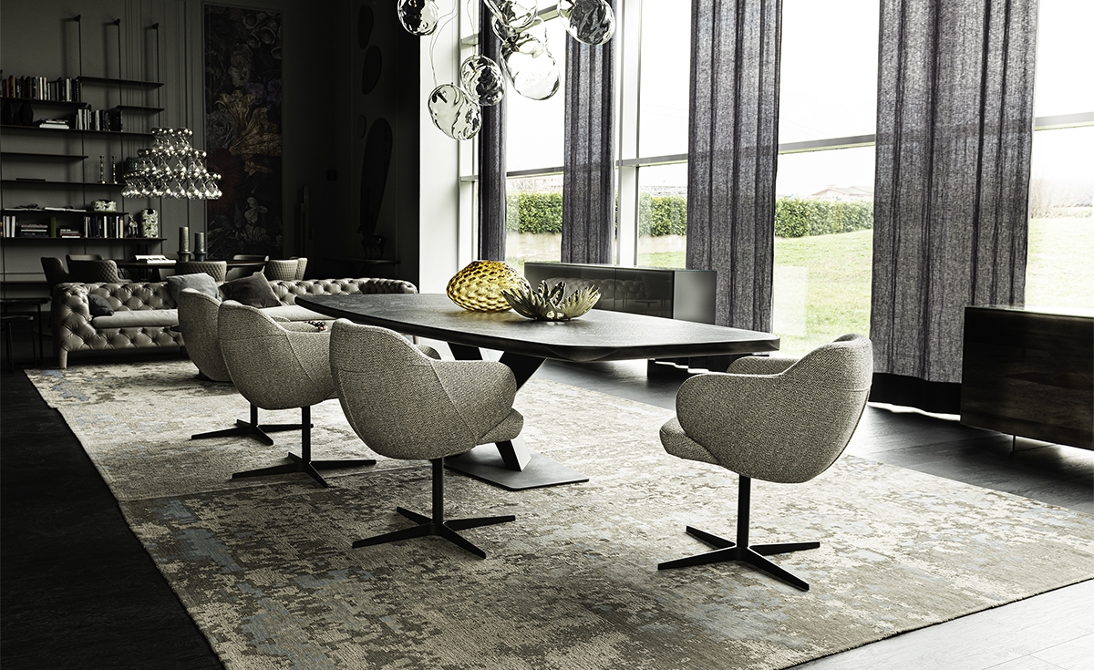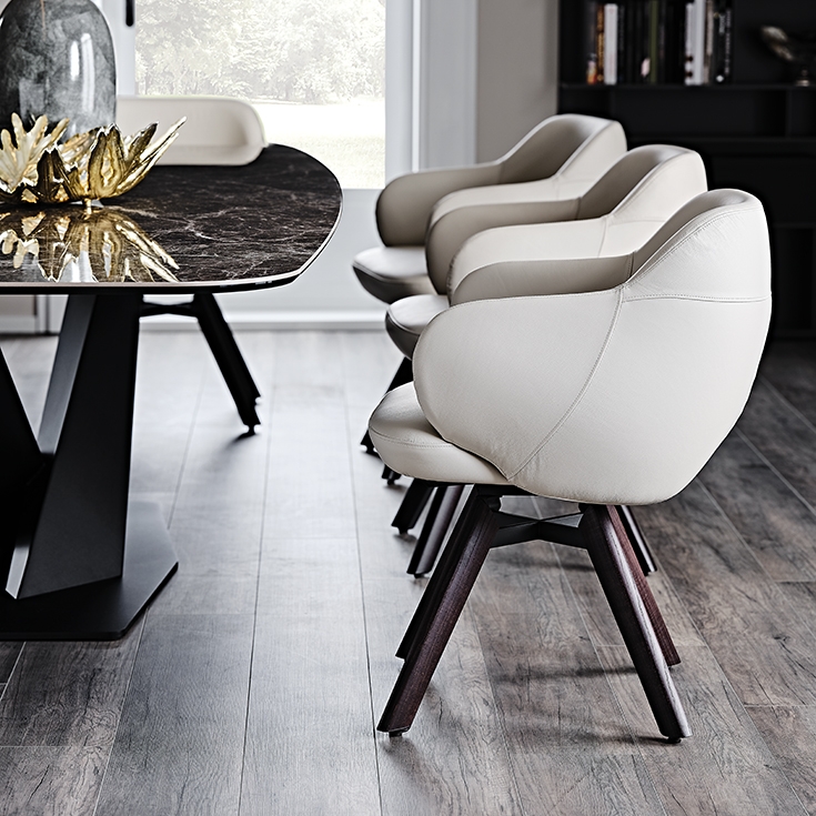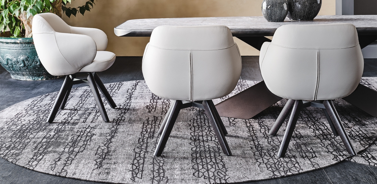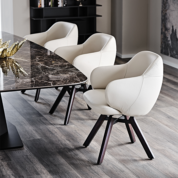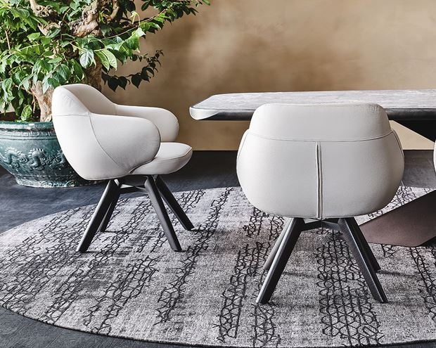 Za družino vrtljivih in povratnih stolov Bombè je značilen ovojni in zaobljen sedež. Eleganten, izdatno oblazinjen stol BOMBÈ ima udoben, trden in funkcionalen školjkast sedež, ki je na voljo v številnih izvrstnih zaključkih. Njegovo unikatno podnožje se prepleta s kovinskim osrednjim delom in masivnimi lesenimi nogami. Model jedilnega stola BOMBÈ X je idealen kot pisarniški stol s svojim 4 krakim lakiranim jeklenim podstavkom. Oba modela sta opremljena z vrtljivim mehanizmom in povratnim sistemom. To pomeni, da stola ni potrebno odmikati od mize pri vstajanju ali posedanju.