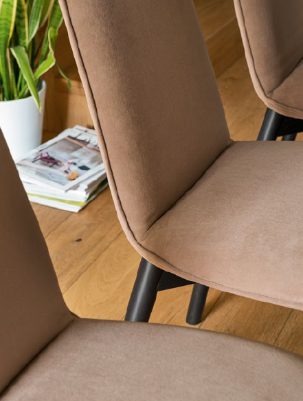 Jedilni stol RILEY je mehak kot oblak. Ima masivno leseno podnožje in visoko naslonjalo. Sedalna lupina je iz mehko oblazinjenega vezanega lesa. Krasi ga šivana obroba na naslonjalu in sedišču, katera ustvarja subtilen valovit vzorec in privlačno prefinjeno teksturo. Na voljo tudi barski stol in stol Riley s kovinskim podnožjem.