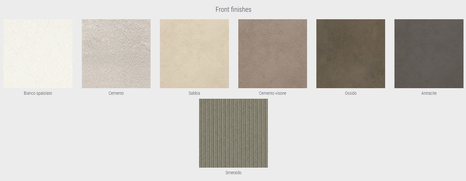Fronte so izdelane iz oplemenitenega, nadgrajenega in termostrukturiranega tehnično obdelanega lesa debeline 22 mm, ki zagotavlja vrhunsko kakovost in dolgo življenjsko dobo. Izdelava ustreza zahtevnim standardom razredov E1 in CARB2, poliuretansko lepljenje pa nudi dodatno robustnost, odpornost in zaščito pred obrabo.