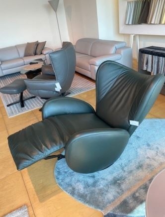 ODPRODAJA SE: Samo z rahlim pritiskom na Soft Touch gumbe, ga spremenite iz sedečega v počivalni položaj. Položaj hrbtnega dela in nog upravljate posamično. Ima tudi vrtljivo kovinsko podnožje, katero olajša gibanje med sproščanjem. Polnite ga lahko z baterijo, kar pomeni, da lahko stoji samostojno v prostoru. Fotelj je oblazinjen v najvišjo kategorijo usnja v zeleni barvi.