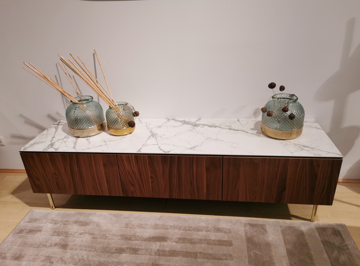 ODPRODAJA SE: Komoda Universal je eden izmed modelov integriranega sistema modularnih omaric z neverjetno vsestransko zasnovo. Komoda poudarja prirojeno eleganco in prefinjenost. Izjemno tanek zgornji del v sivo beli keramiki je poravnan z linijami vrat v orehovem furnirju. Izstopajo cevaste nogice v svetleče zlati barvi.