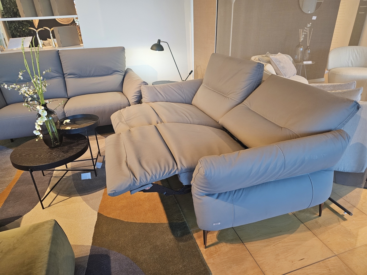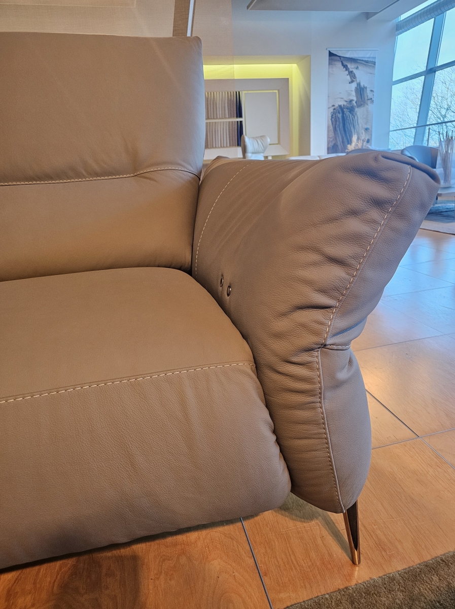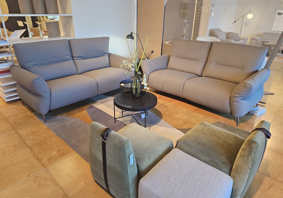ODPRODAJA SE: Set dveh trosedov sedežne garniture Macao v kakovostnem Natuzzi usnju sive barve. Eden trosed ima vključena dva električna počivalnika z Relax funkcijo, drugi je brez.