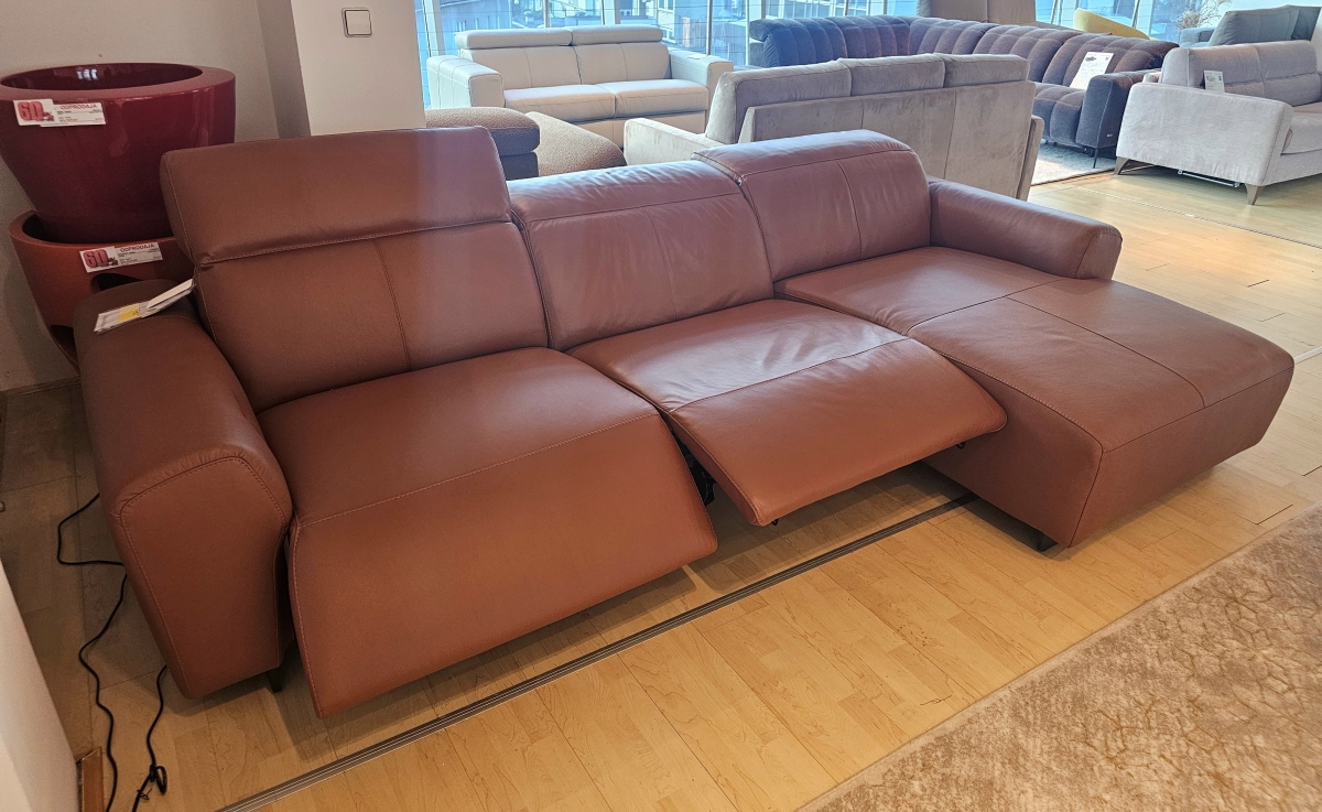 ODPRODAJA SE: Kotna garnitura Modus, z dvema električnima počilnikoma z Relax funkcijo v temno rdečem usnju.