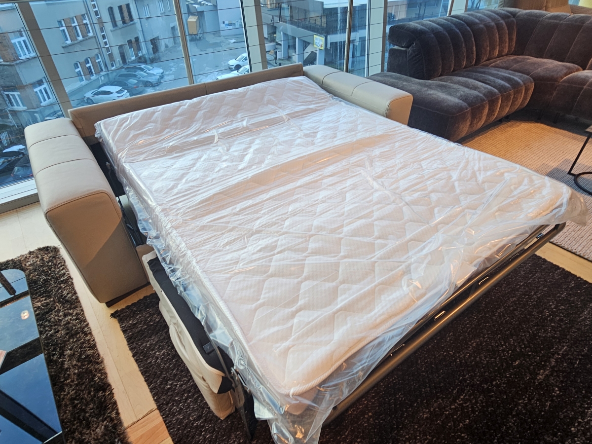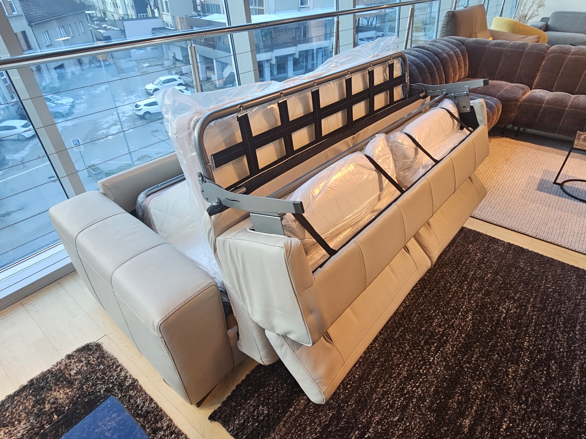 ODPRODAJA SE: Trosed sedežne garniture Piacevole v usnju bež barve. Trosed ima vključeno dodatno ležišče, v dimenzijah 140x195 cm.