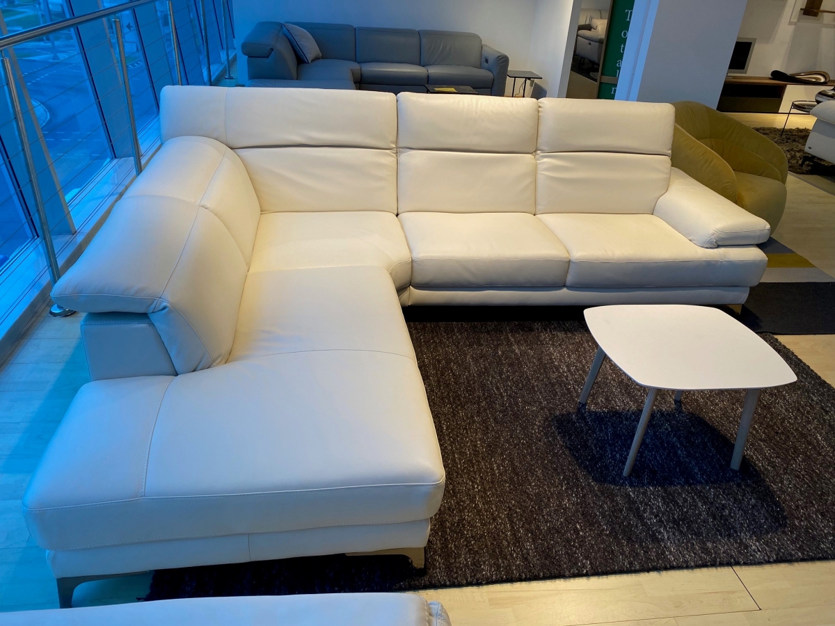 ODPRODAJA SE: usnjena kotna sedežna garnitura Speranza, z dvižnimi nasloni za glavo. Sedežna garnitura je oblazinjena v belo vrhunsko Natuzzi usnje.