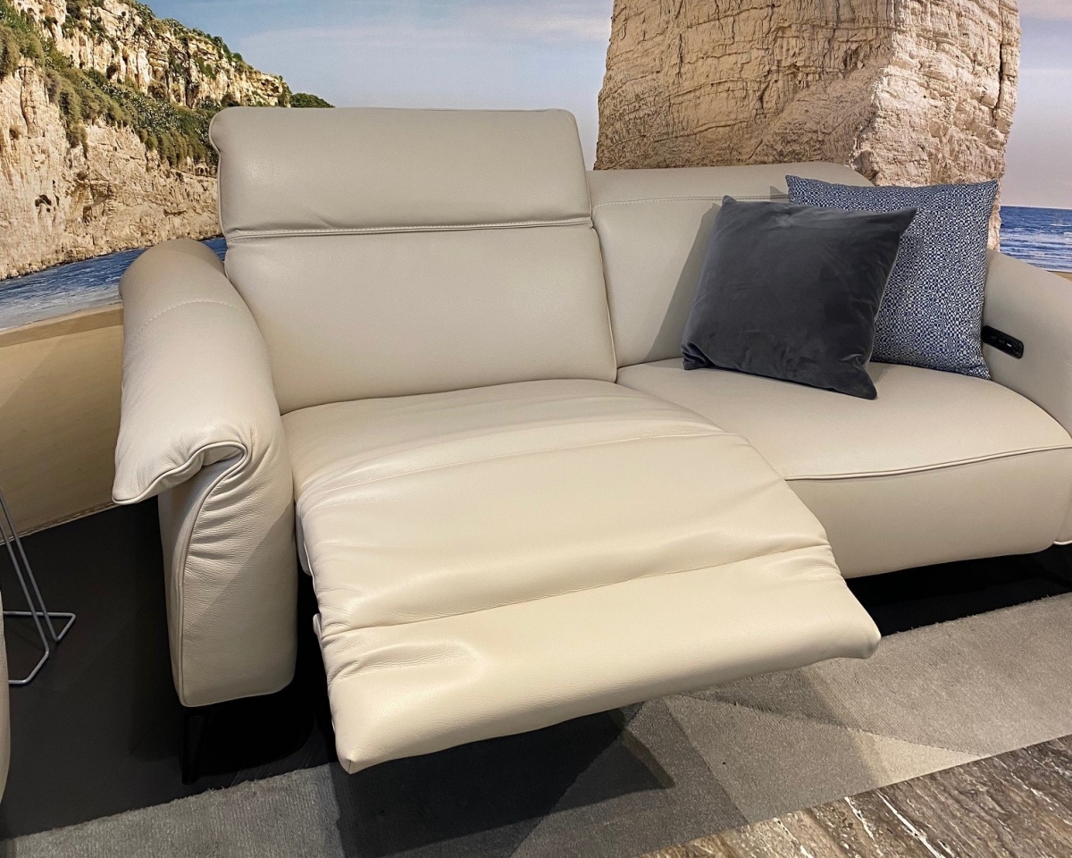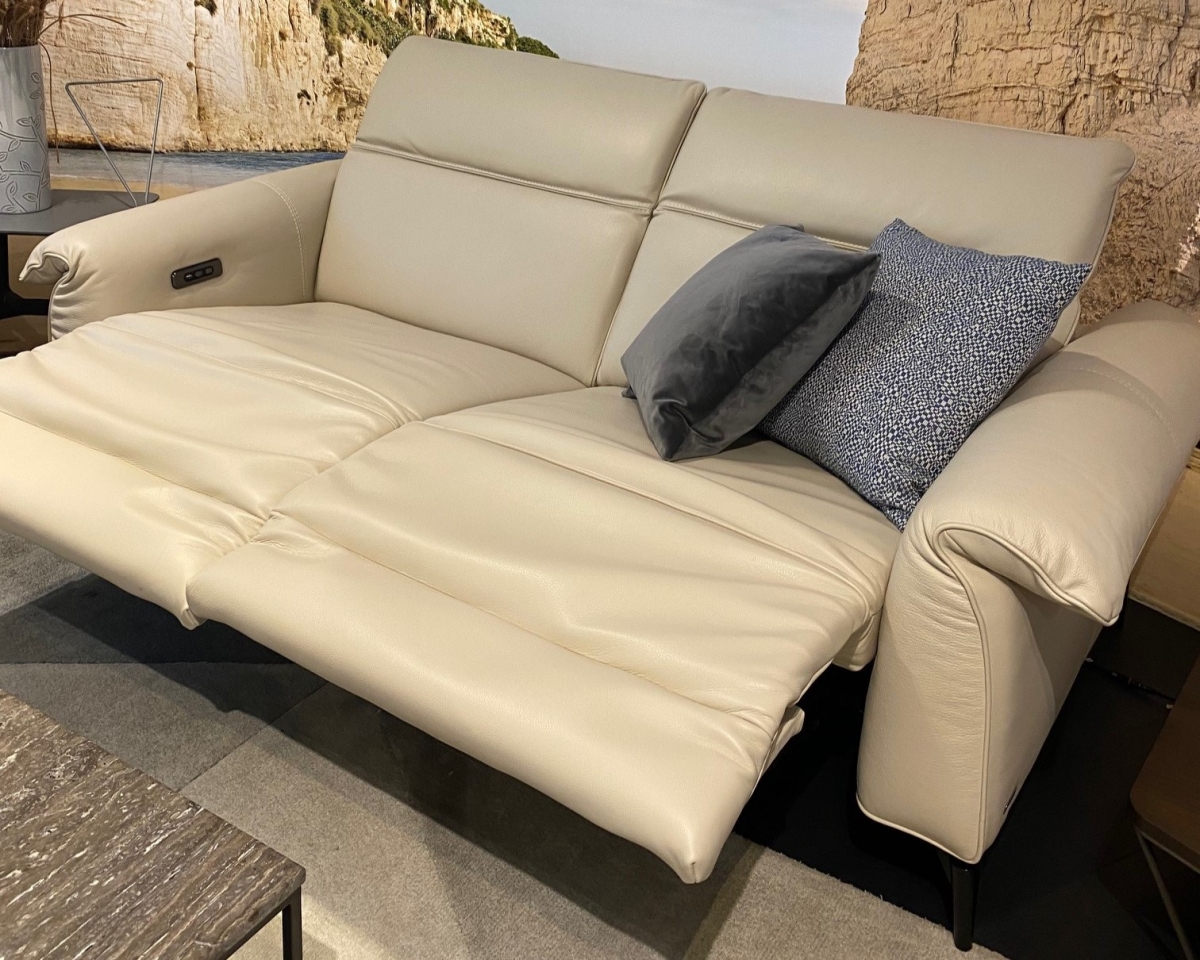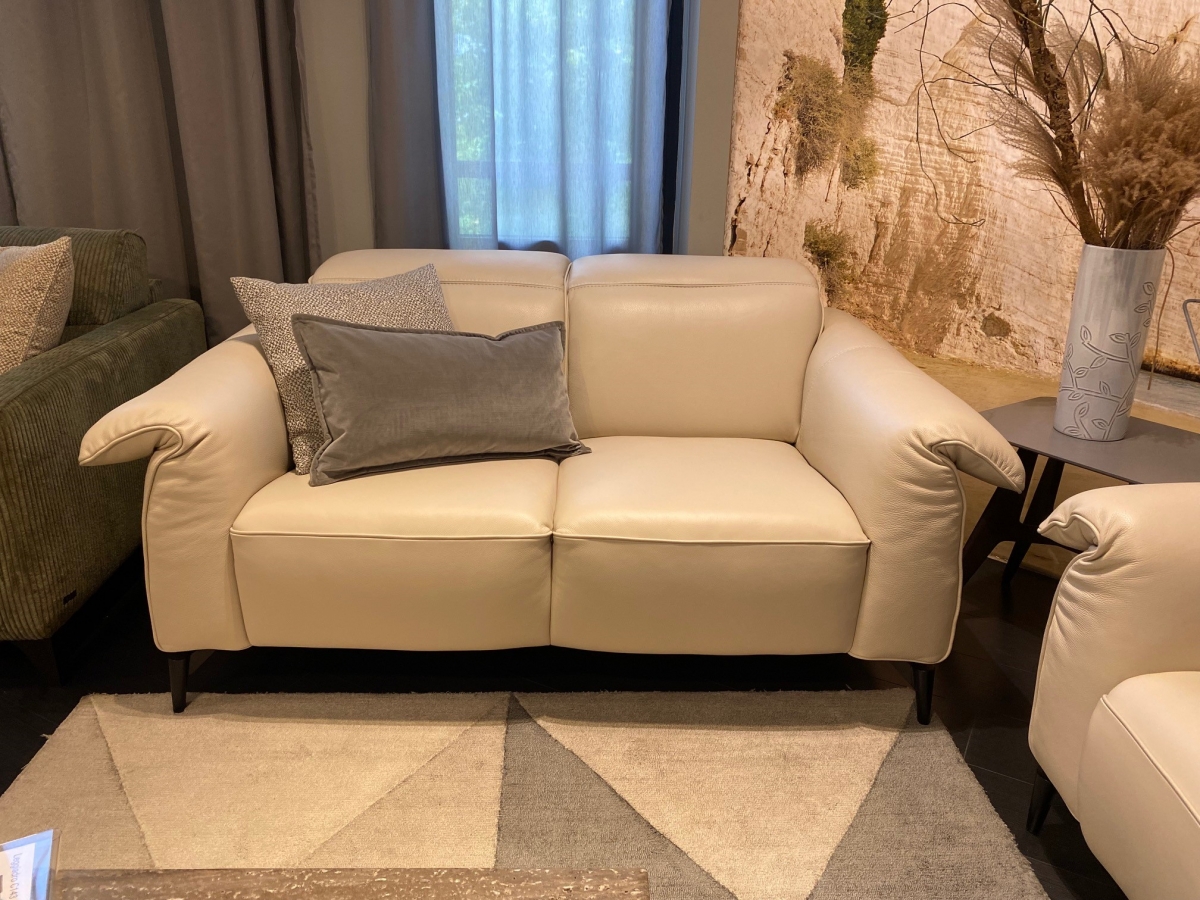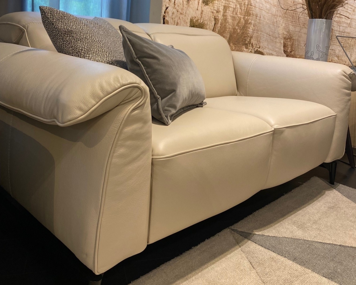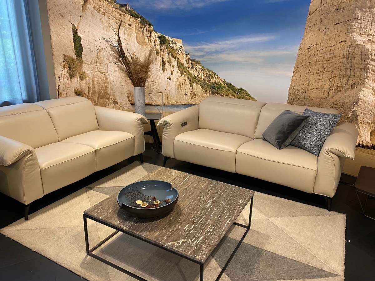 ODPRODAJA SE: trosed z el.počivalnikoma in dvosed sedežne garniture Leggiadro z dvižnimi nasloni za glavo. Sedežna garnitura je oblazinjena v vrhunsko, mehko Natuzzi usnje v bež odtenku dream 20JJ.