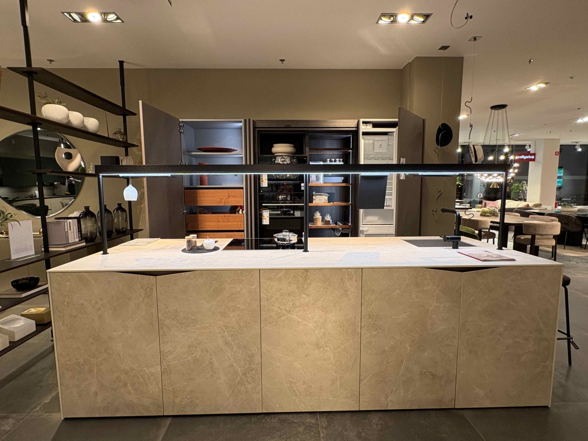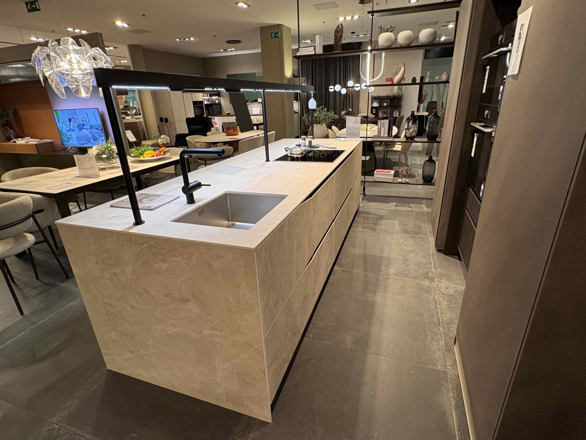 Posebnost kuhinje je monolitni otok, ki je v celoti izdelan iz vrhunske keramike: fronte, delovna površina (pult) in obod otoka (stranice). Na otoku je kuhalna plošča in pod-pultno korito. Celotno delovno površino na otoku osvetljuje več funkcijska konzola z različnimi nastavki in dodatki.