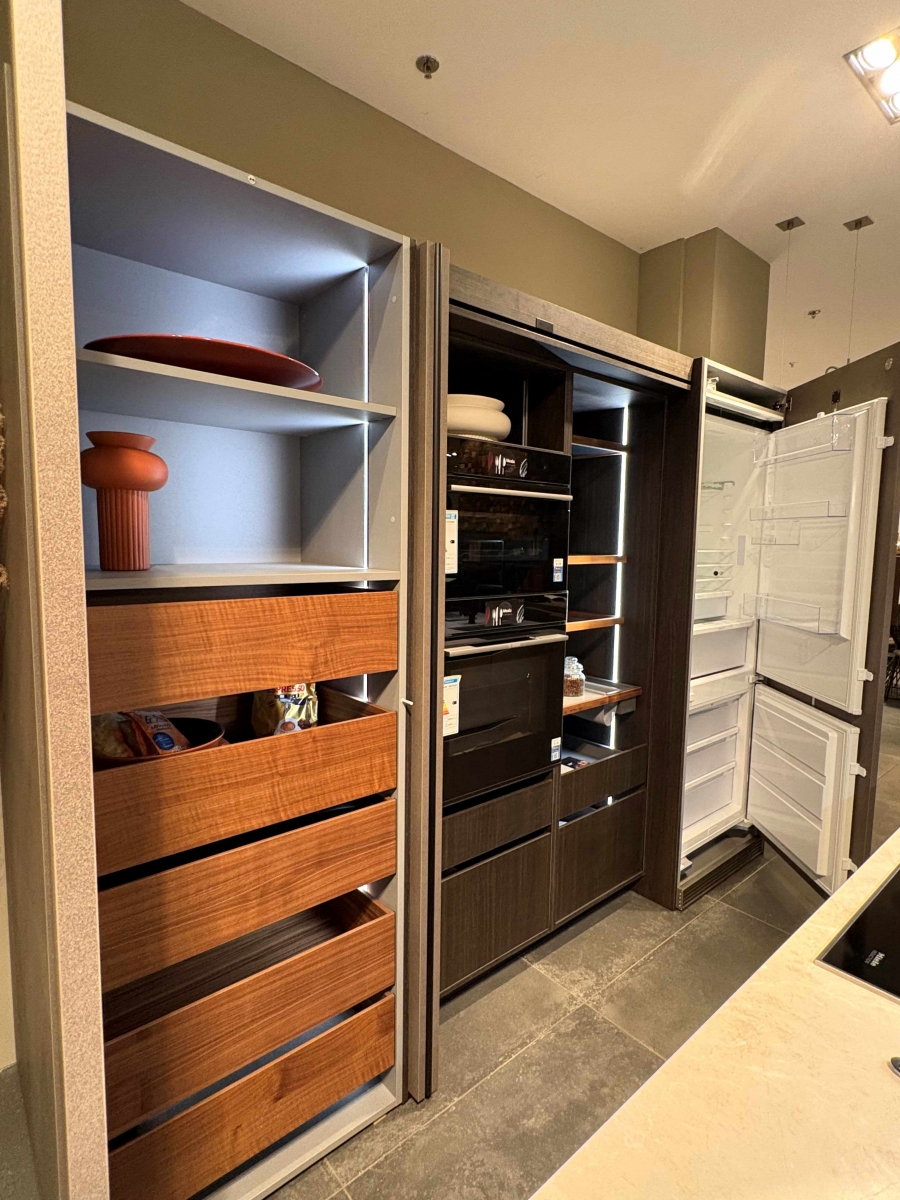 ODPRODAJA SE: kuhinja ELEMENTI v linijski postavitvi z otokom. Visoke omare z »pocket-door« odpiranjem vsebujejo elemente za hladilnik (električno odpiranje), dve pečici in omare oz. predale za shranjevanje. Fronte visokih omar so v vrhunskem materialu t.i. Techmateric s poudarjeno strukturo in ABS robom.