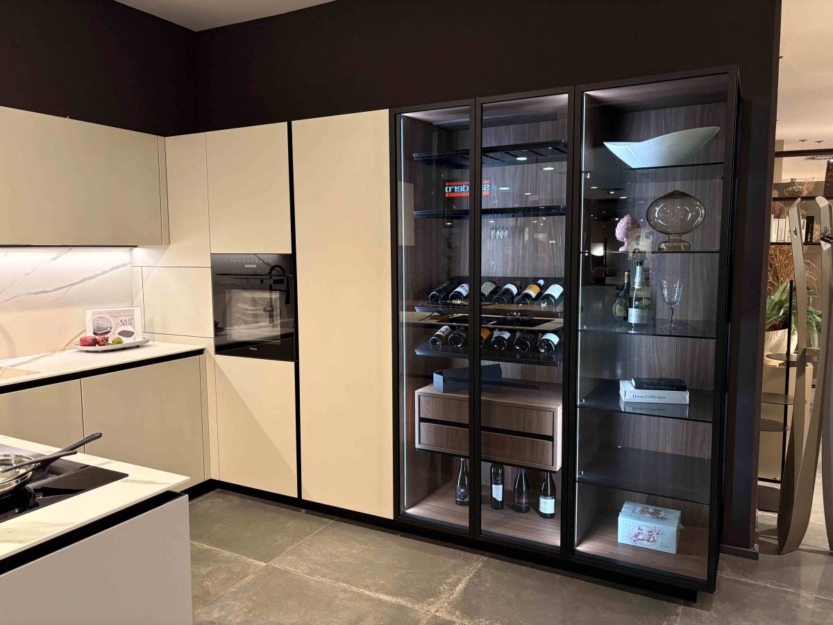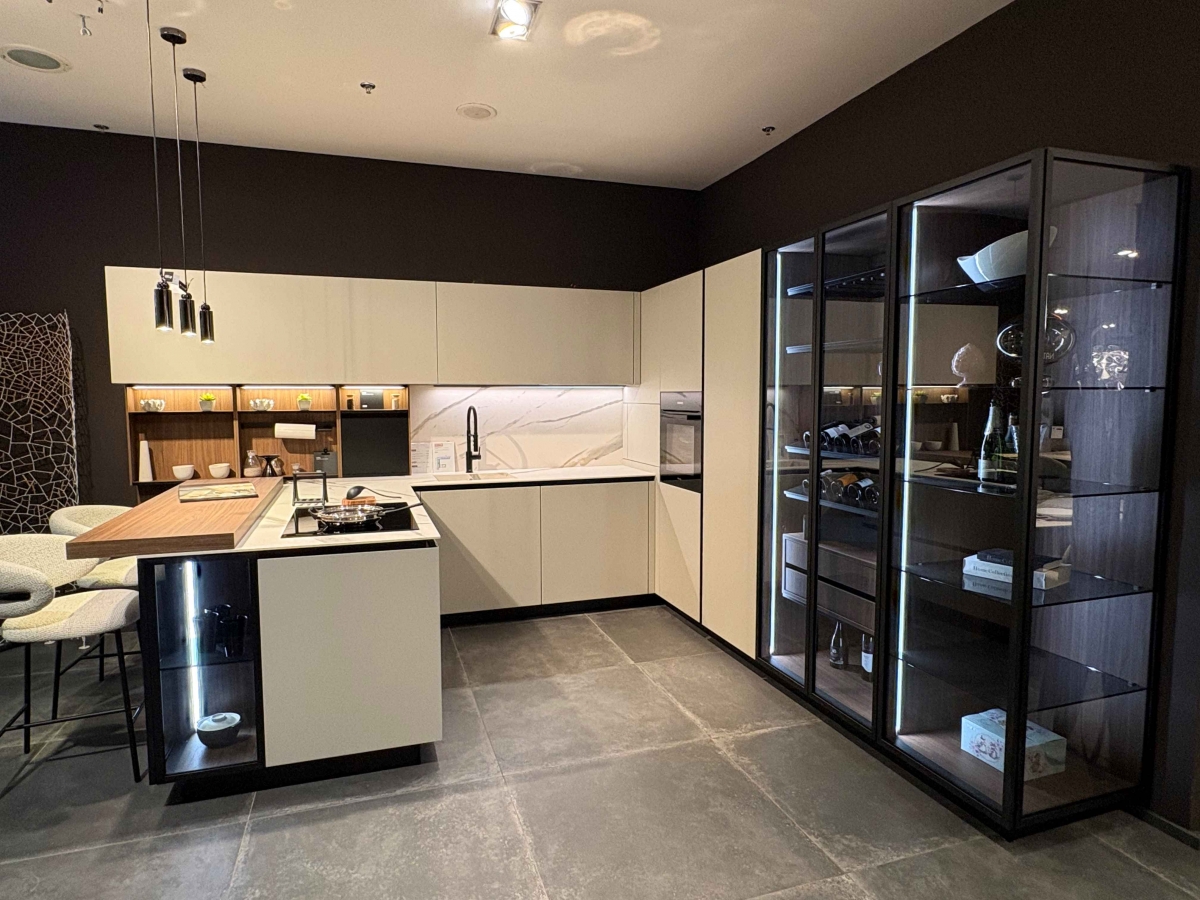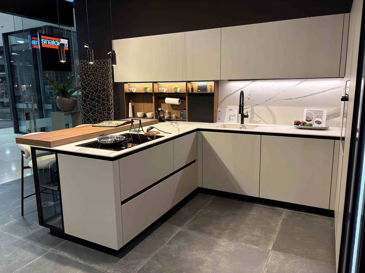 ODPRODAJA SE: kuhinja LINK v "U" postavitvi z polotokom. Fronte kuhinje so v kombinaciji mat Micalized laka v belo peščeni barvi in dodatkov v imitaciji oreha. Pult je izdelan iz keramike v videzu marmorja v katerega je integrirano pomivalno korito v istem materialu. Posebnost kuhinje Link so viseče omarice z električnim odpiranjem in Rialto vitrine z osvetlitvijo. Kuhinjski niz vsebuje plitve omarice t.i. E-Wall z odprtimi odlagalnimi površinami v videzu lesa in kombinacije črne kovine. Kuhinjski sestav vključuje tudi omaro za hladilnik, pečico in izvlečeno omaro za shranjevanje živil.