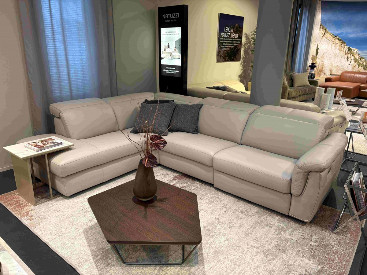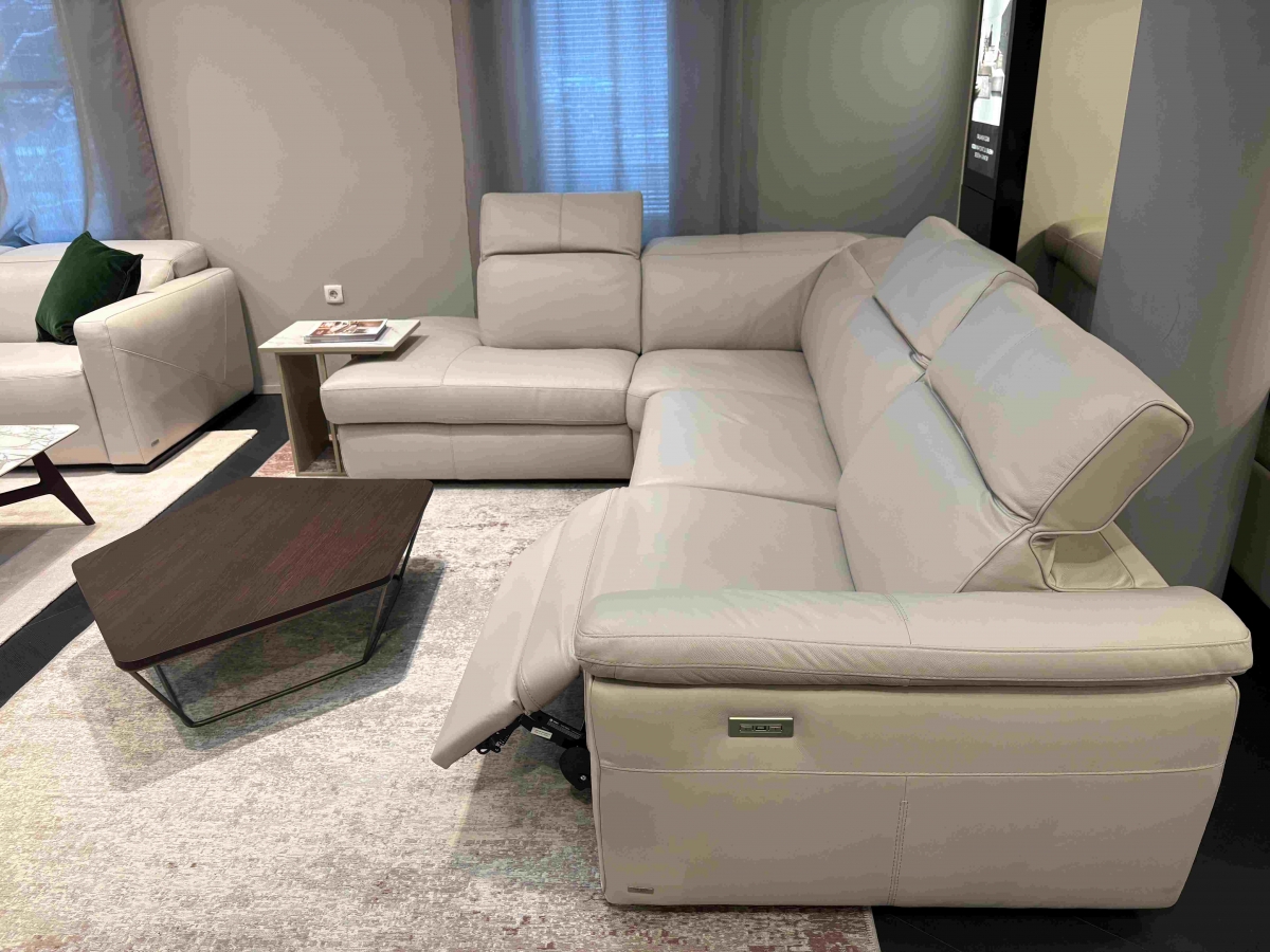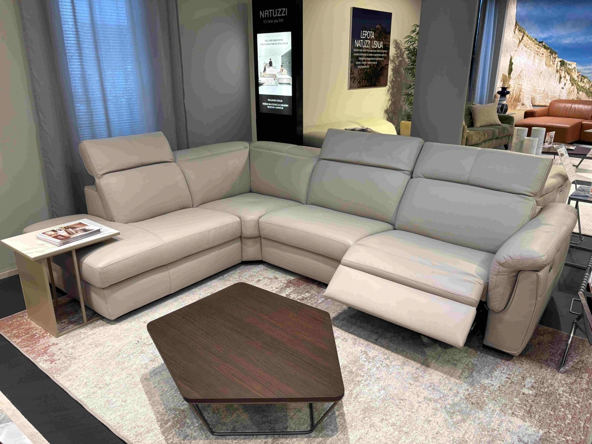 ODPRODAJA SE: Kotna sedežna garnitura Curioso z dvižnimi nasloni za glavo in električnim počivalnikom na desnem dvosedu. Garnitura je tapecirana v vrhunsko Natuzzi usnje v svetlo sivo - bež barvi.