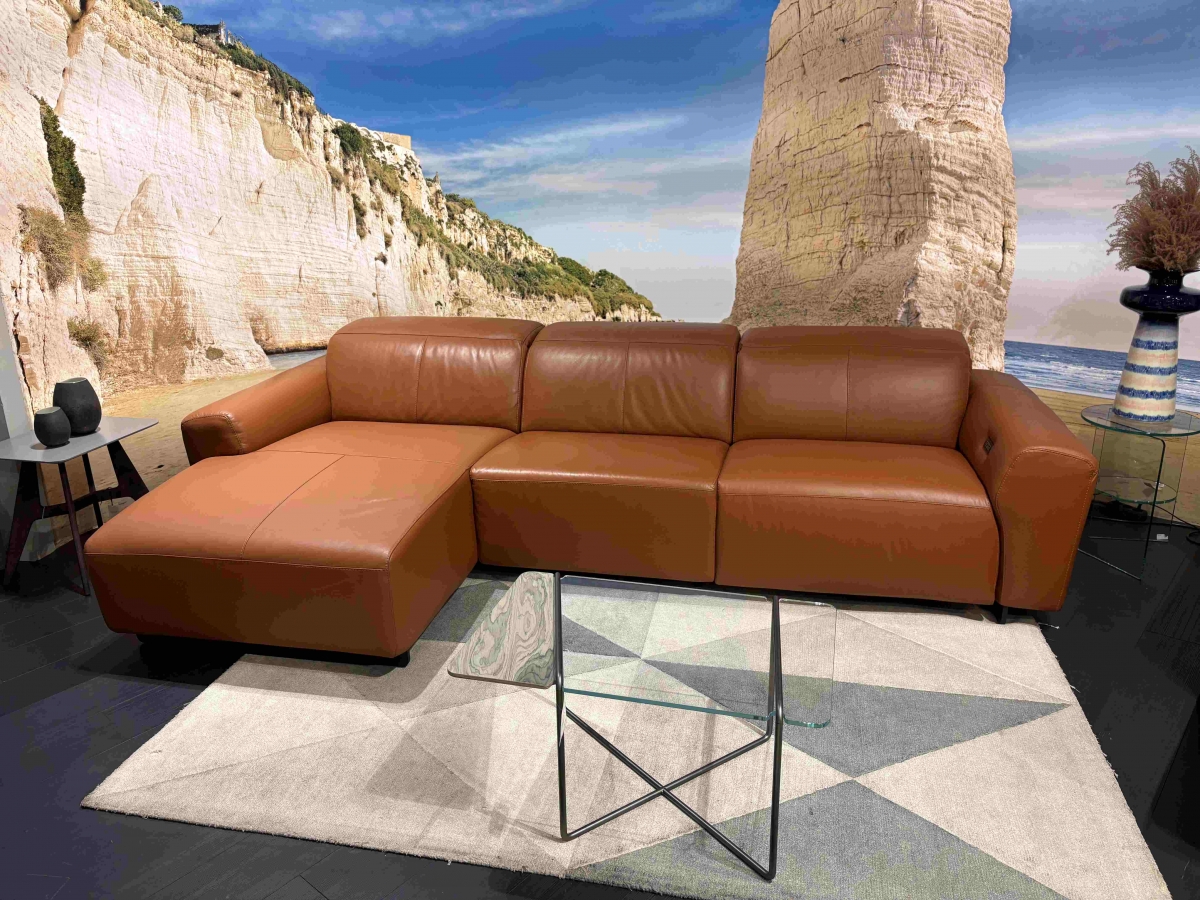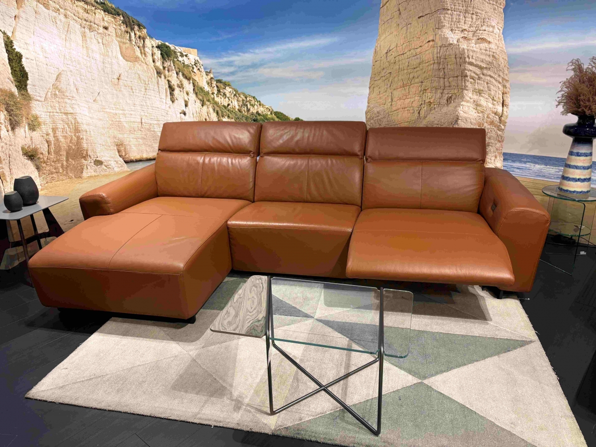 ODPRODAJA SE: Sedežna garnitura Modus z dvižnimi nasloni za glavo in električnim počivalnikom na desnem dvosedu. Garnitura je tapecirana v vrhunsko Natuzzi usnje rjave barve