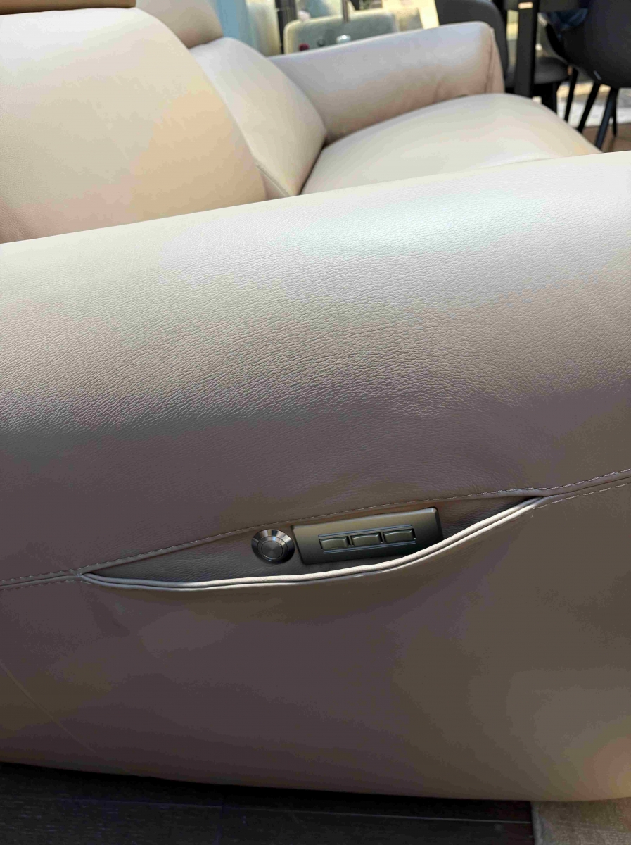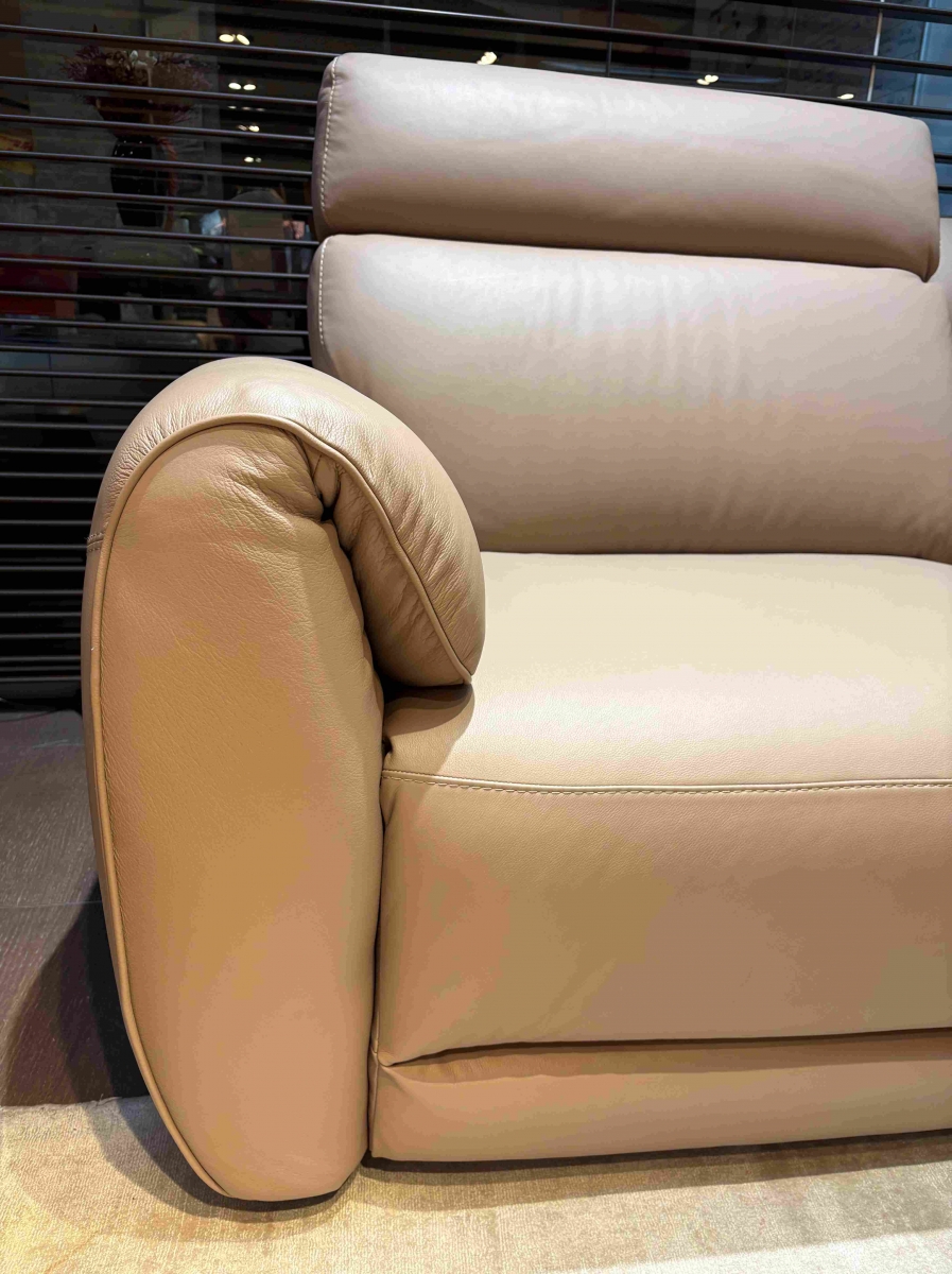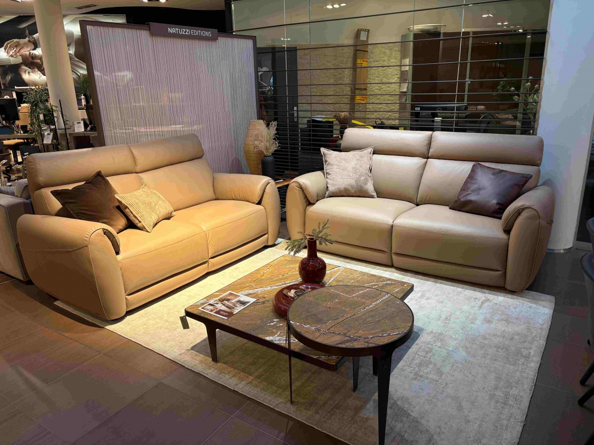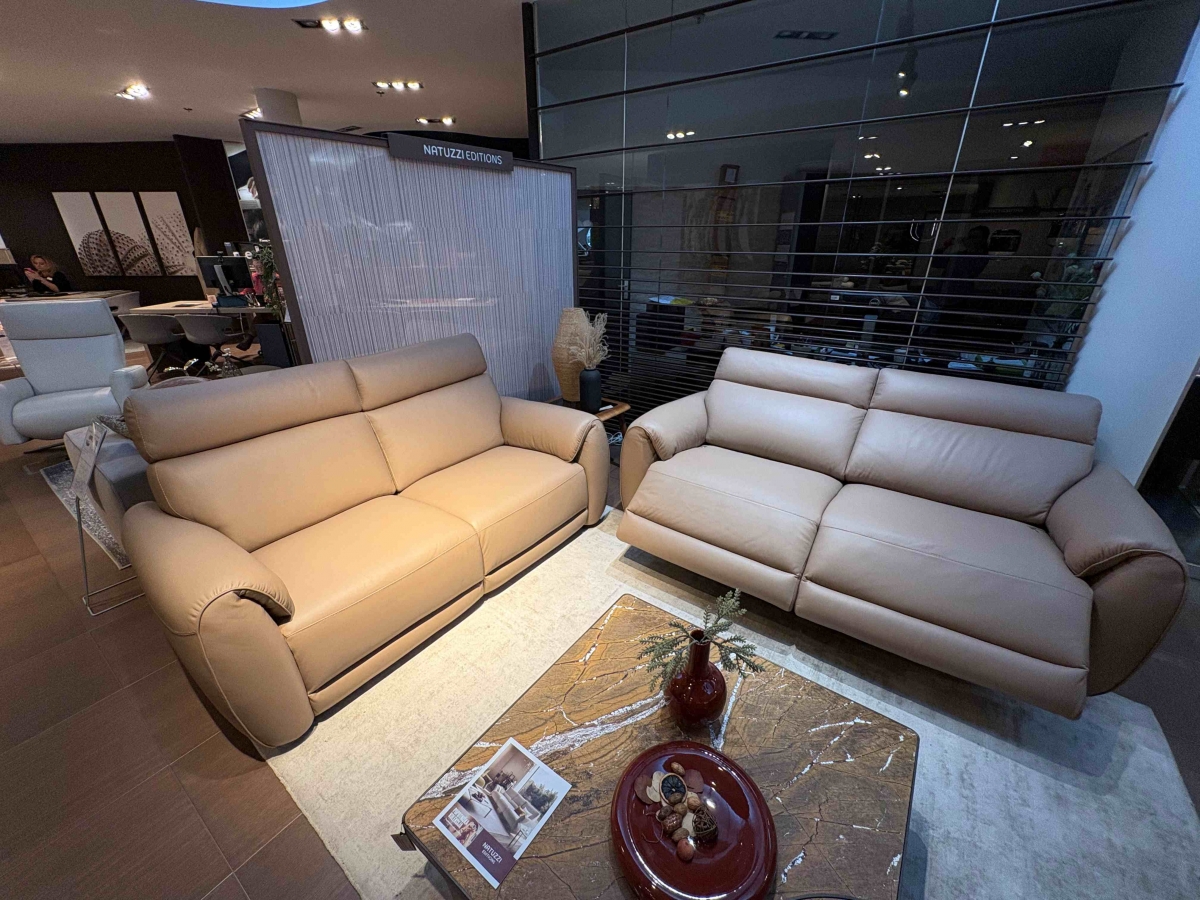 ODPRODAJA SE: Set trosed in dvosed sedežne garniture Nuvia v kakovostnem Natuzzi usnju svetlo rjave barve. Trosed ima vključena dva električna počivalnika z Relax funkcijo.