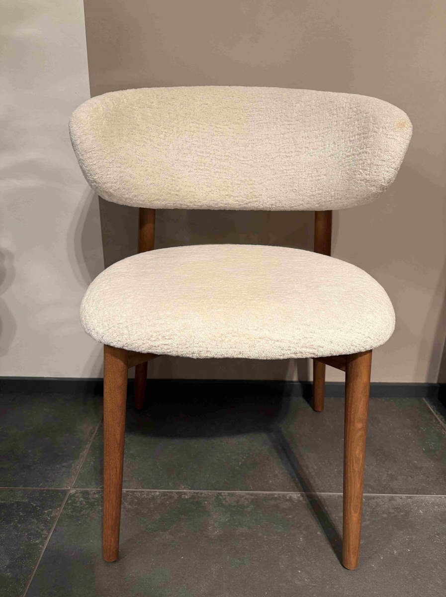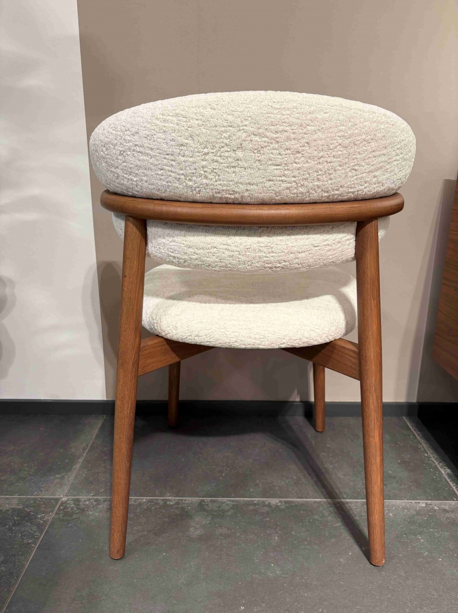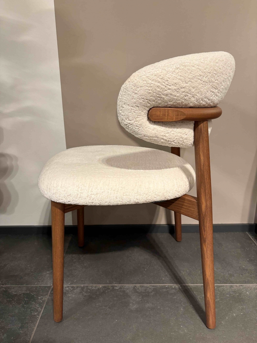 ODPRODAJA SE: 4 kosi stolov Oleandro. Stoli so na lesenem podnožju v barvi oreha, sedišče je oblazinjeno v svetlo bež tkanino.