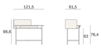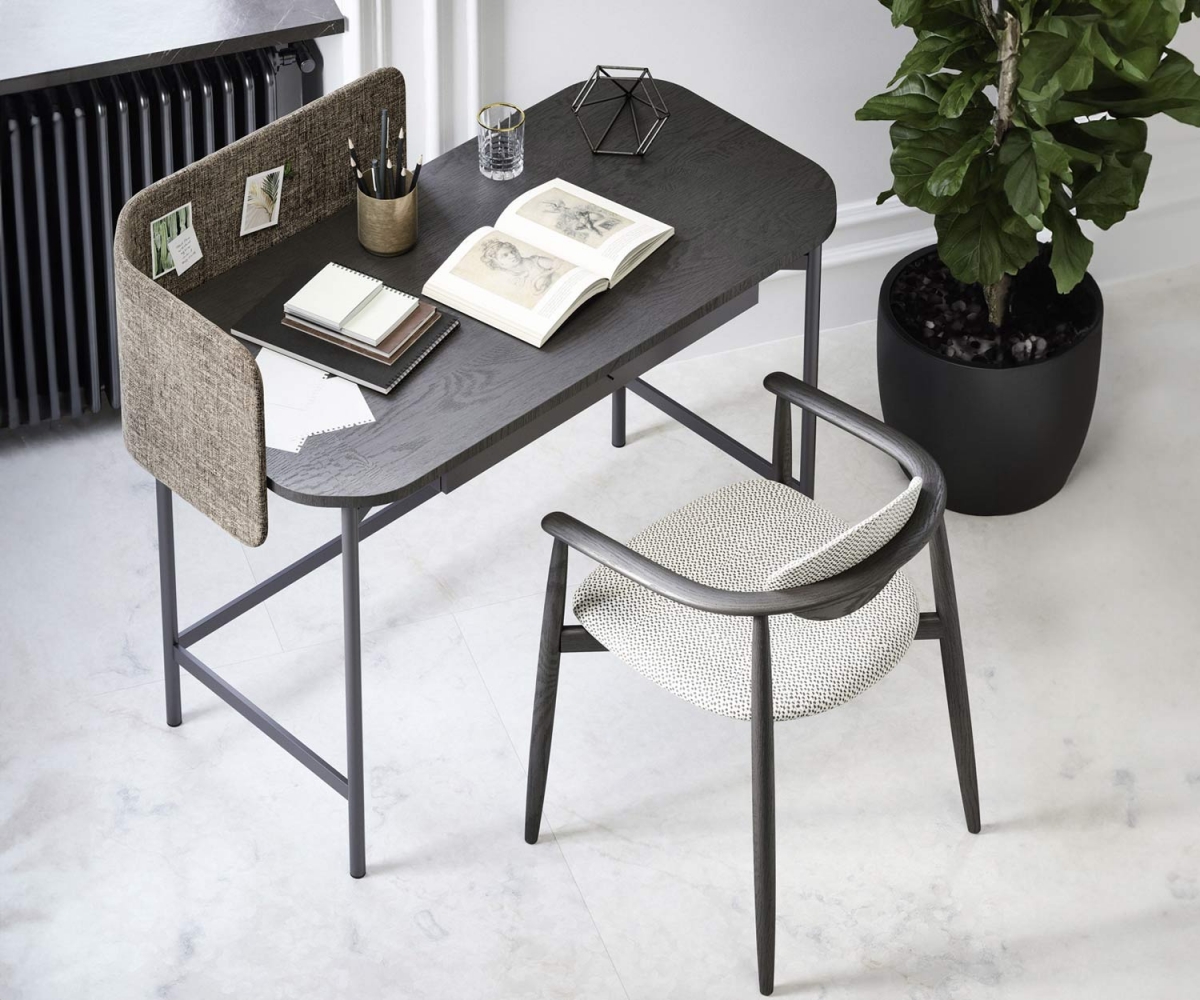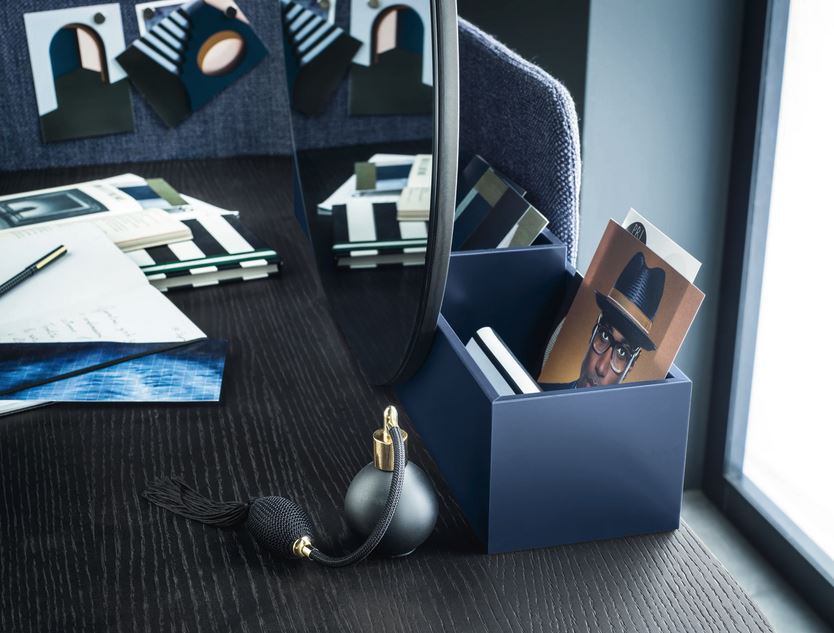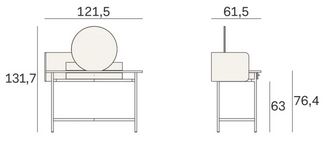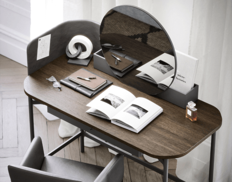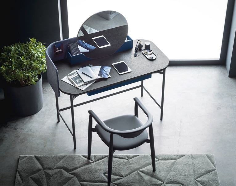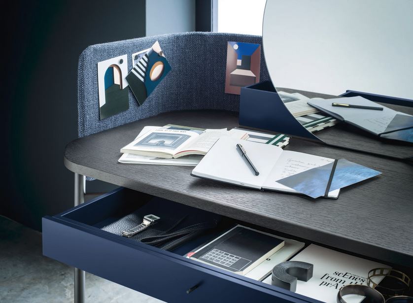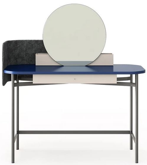 NINFEA je nežna in elegantna pisalna mizica. Plošča z zaobljenimi oblikami stoji na vitkih kovinskih nogah, s spodaj nameščenim predalom in zaslonom za zasebnost, oblazinjenim z odstranljivo tkanino ali umetnim usnjem. Majhen zaslon služi tudi kot oglasna deska za objavljanje zapiskov in dokumentov z uporabo magnetov. Pisalna mizica, ki je idealna za poustvaritev delovnega kotička v spalnici, ima postavitev v slogu toaletne mizice z lesenim nosilcem in okroglim ogledalom.