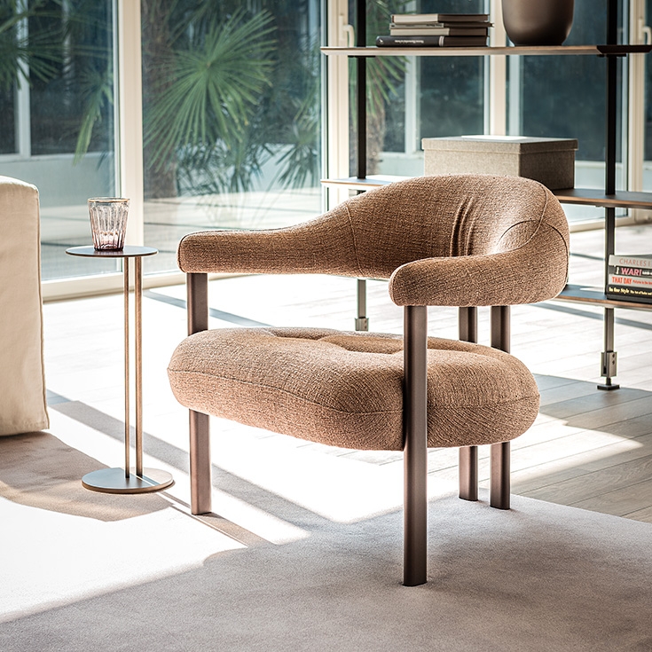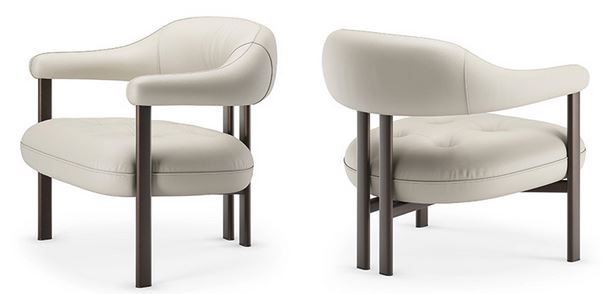 Videz lebdečega naslonjala za hrbet na tem dizajnerskem naslanjaču, je prav tako mehko in udobno. Sestavljeno je iz ukrivljenega, oblikovanega valja, ki se ovije okoli hrbta in se konča z udobnimi oblazinjenimi nasloni za roke. Med sedežem in podnožjem je ustvarjena zanimiva igra kontrastov, ki prekrivajo mehke in kovinske materiale, trdne in prazne volumne, prijetne in ostre konture. Tri vitke noge tvorijo kovinske cevi z eliptičnim prečnim prerezom, prevlečene s teksturiranim lakom v različnih elegantnih odtenkih, ki se ujemajo s široko paleto tkanin in usnja v zbirki vzorcev. Osrednja noga na hrbtni strani tega modernega fotelja sta pravzaprav dve nogi, ki sta postavljeni blizu skupaj, da ustvarita eno samo točko opore. Navpični prostor v sredini temelji na konceptu trdnih in praznih prostorov med naslonom in sedežem. Rezultat je kohezivna zasnova, ki daje splošen občutek lahkosti in uravnoteženosti.