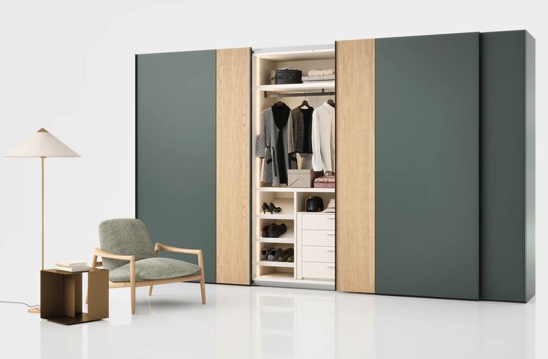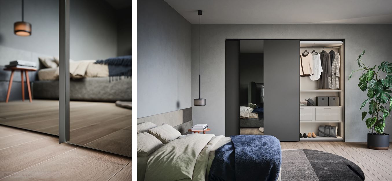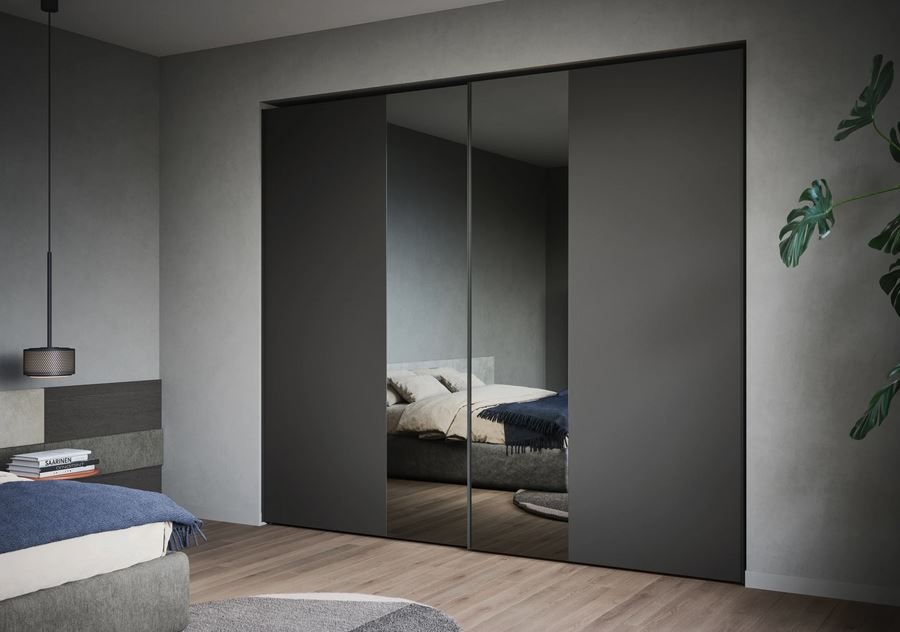 Sodobne linije za garderobno omaro z drsnimi vrati OFFSET. Panel in vložek sta na voljo v vseh mat in oksidirano lakiranih barvah, v eko lesu in super mat izvedbi. Vložek je na voljo v zrcalni različici.