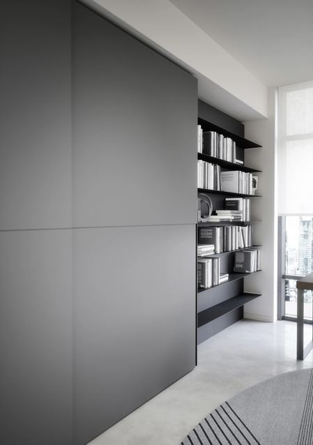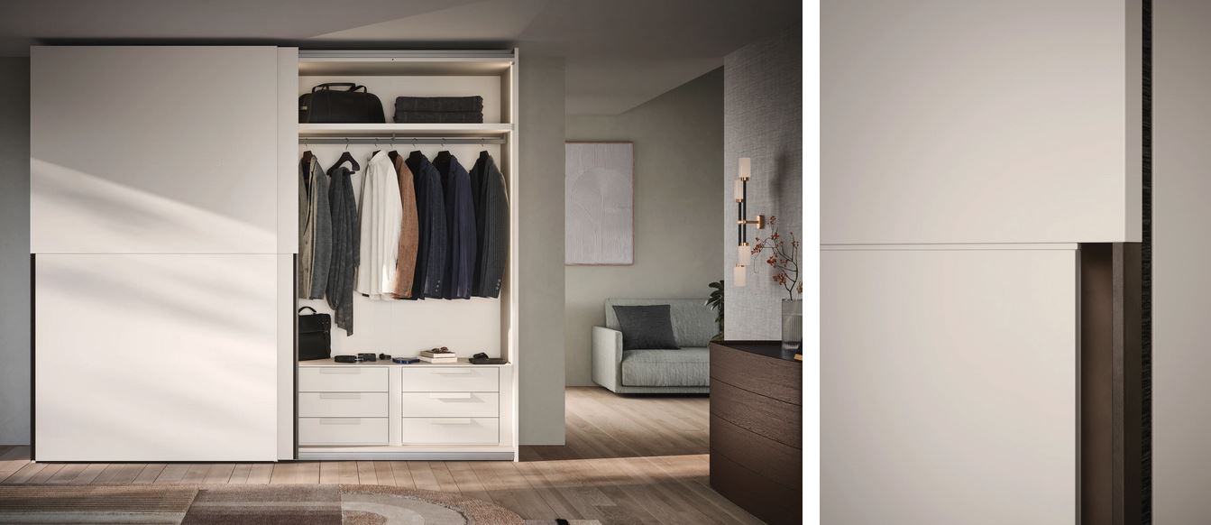 Uravnotežena oblika zaznamuje garderobno omaro z drsnimi vrati PICTURE, kjer je kontrastni profilni ročaj sestavni del samih vrat. Omaro je mogoče vgraditi ali postaviti ob steno. Na voljo tudi drsna omara z ravnim zapiranjem - Flush closing.