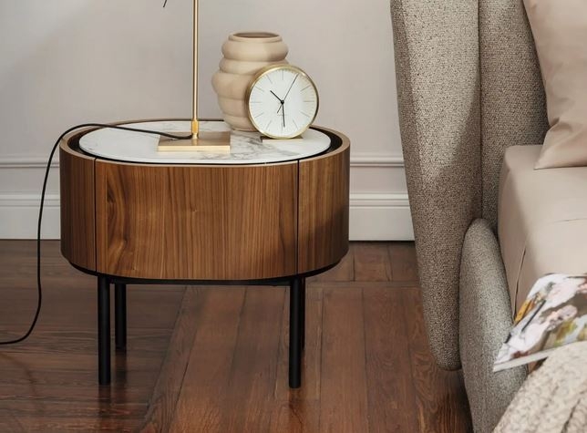 Nočna omarica LAKE je prefinjen dizajnerski kos pohištva. Nočna omarica Lake je na dvignjenem kovinskem podnožju v črni barvi in ima mehko zaobljeno ovalno obliko, njeno lepoto pa poudarja zgornja keramična plošča. Plošča je nekoliko odmaknjena od roba, da ustvarja prostor med predalom in ploščo, ki je uporaben za enostavno odpiranje predala. Vrhnjo ploščo v keramiki lahko nadomestite tudi s ploščo iz kaljenega stekla. Na voljo v orehovem furnirju in furnirju temnega hrasta.