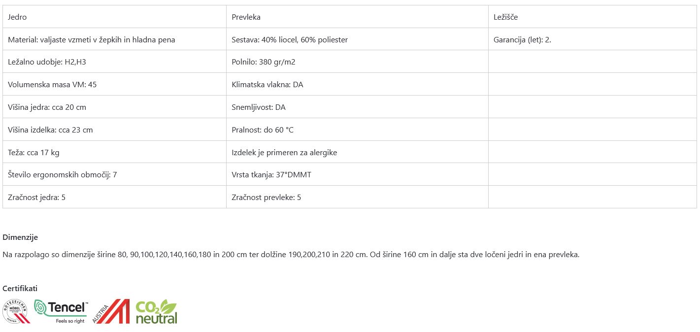 Jedro: 20 cm; večslojno jedro z enostranskim ležalnim udobjem; 6 cm hladna pena (VM 45), 12 cm jedro z valjastimi vzmetni v žepkih, posamično ovite vzmeti (približno 400 vzmeti /2 m2), 2 cm penasta obloga jedra z vzmetmi