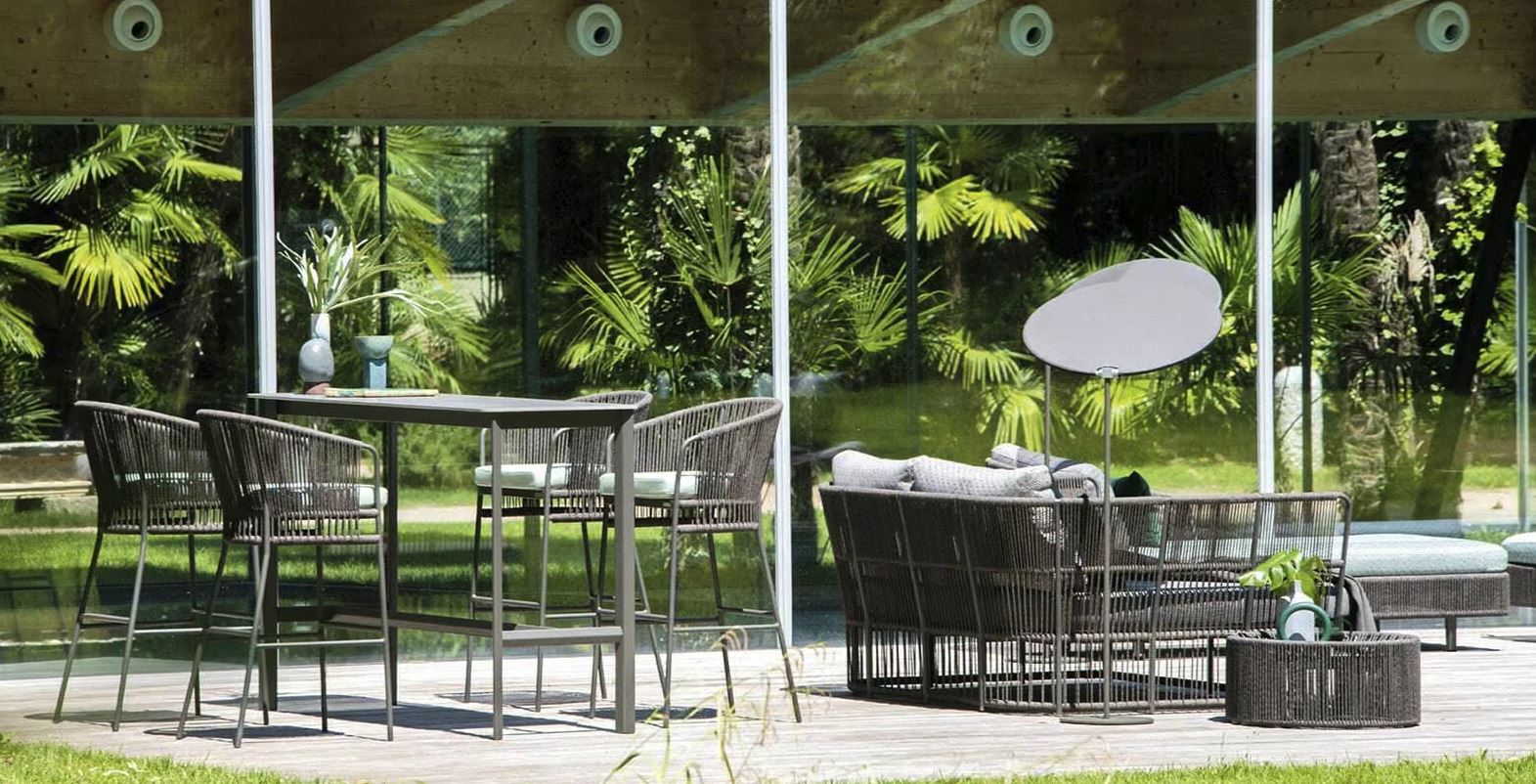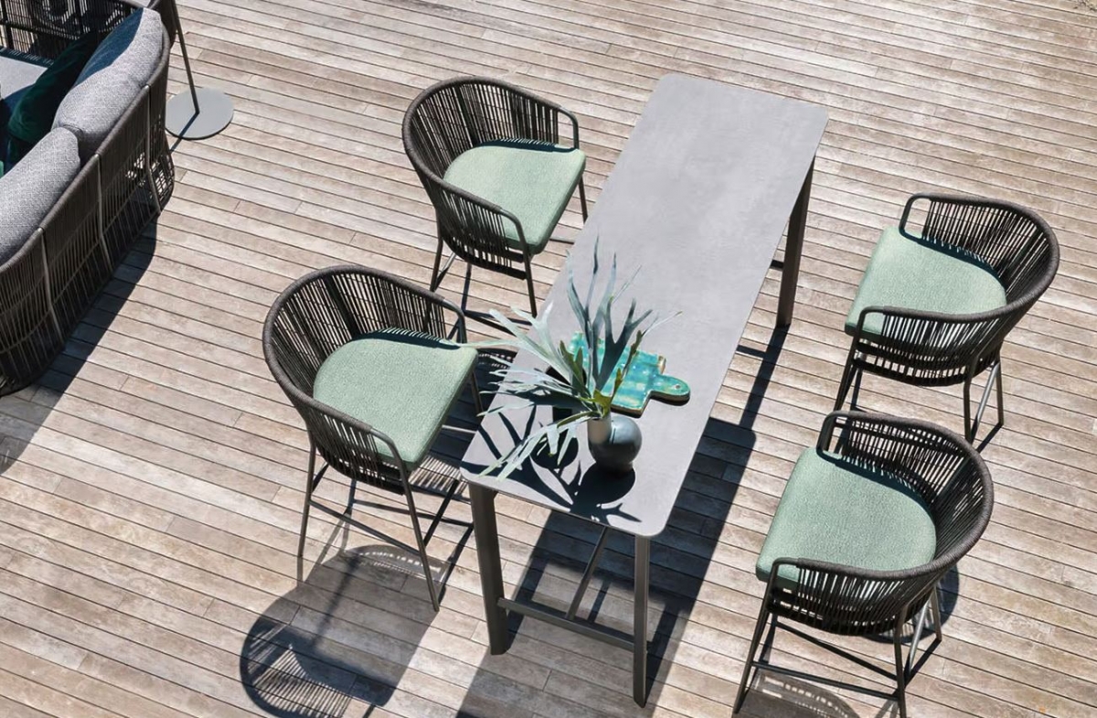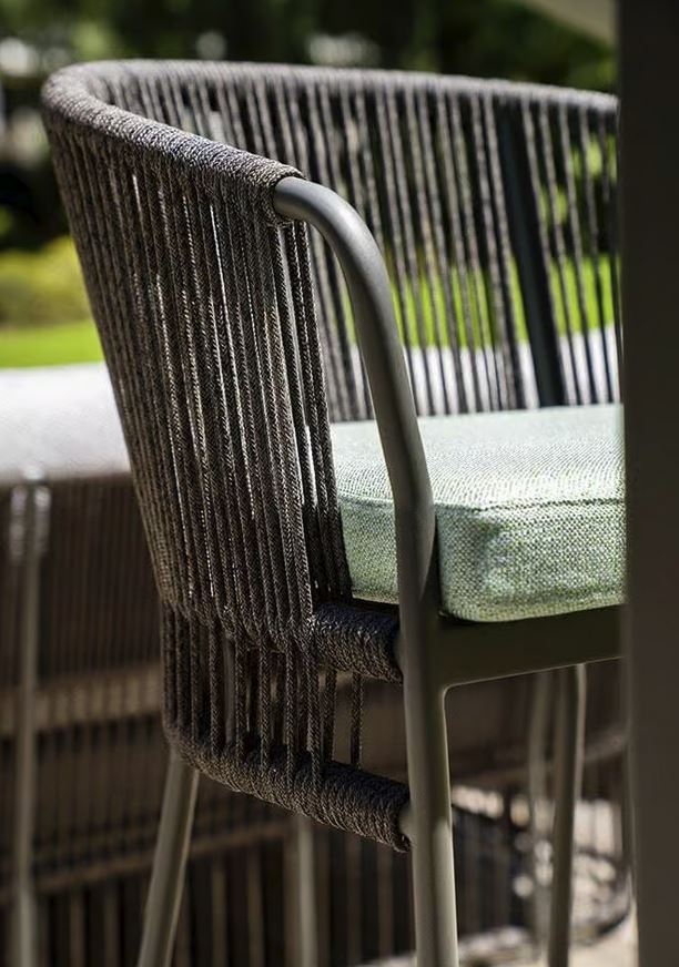 Vitek in eleganten barski stol Tibidabo ima aluminijasto konstrukcijo, okrašeno z zračno, ročno prepleteno vrvjo izdelano iz sintetičnih vlaken. Visoko in obdajajoče naslonjalo naredi ta sedež izjemno udoben za vse priložnosti. Odlično se poda k barskim mizam iz kolekcij Varaschin.