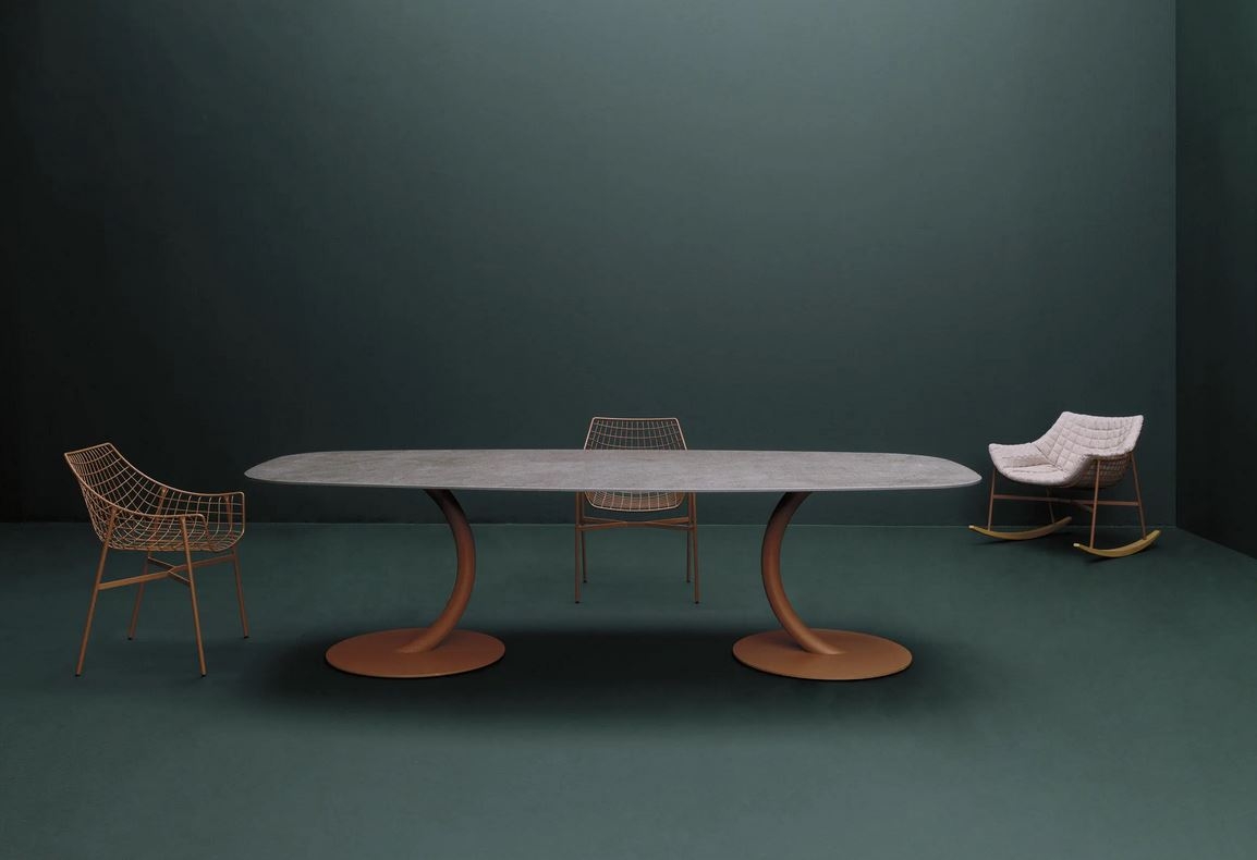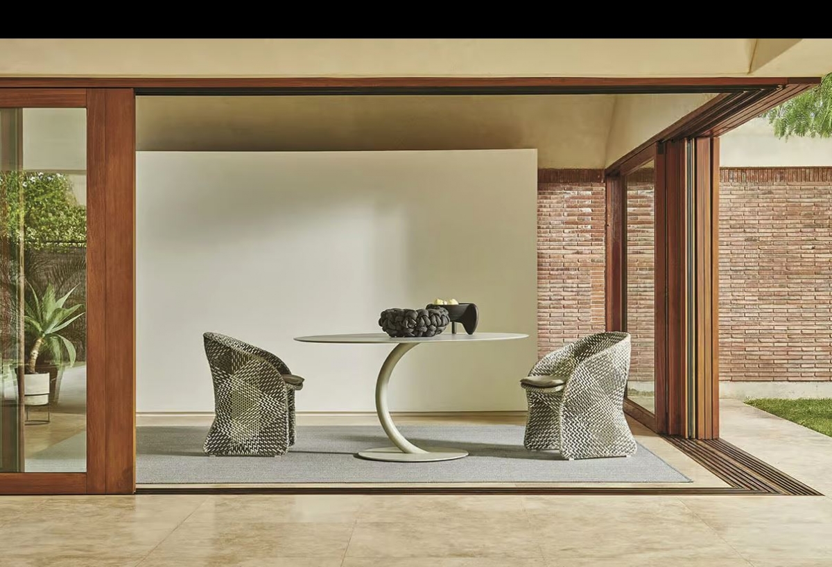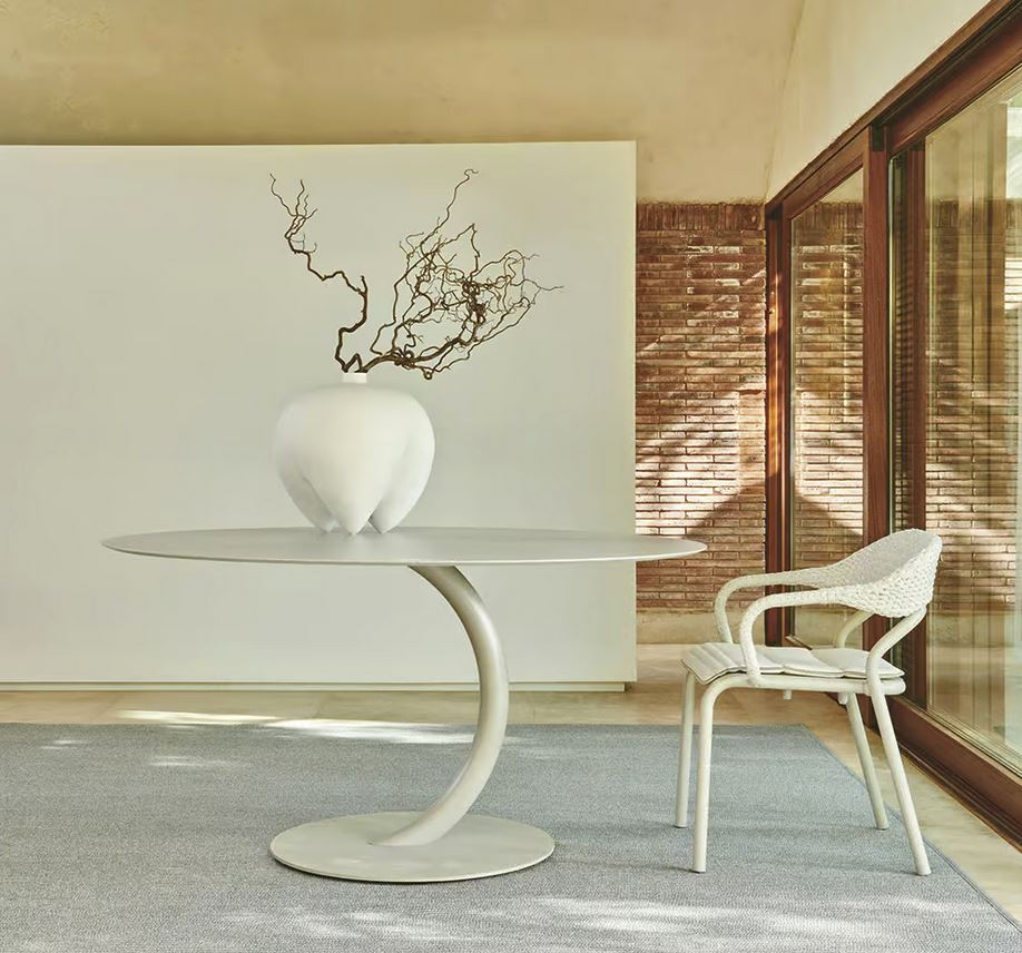 Silhueta s tekočimi in mehkimi linijami, ki daje prostoru izvirno obliko. Miza Flexion, za katero je značilno ukrivljeno steblo podnožja z različnimi okroglimi, eliptičnimi ali organskimi oblikami mizne plošče, se lahko prilagodi najrazličnejšim zunanjim okoljem. Edinstvena oblika podnožja je izdelana iz jekla z zaščitnim ciklom kataforeze in prašnim premazom.