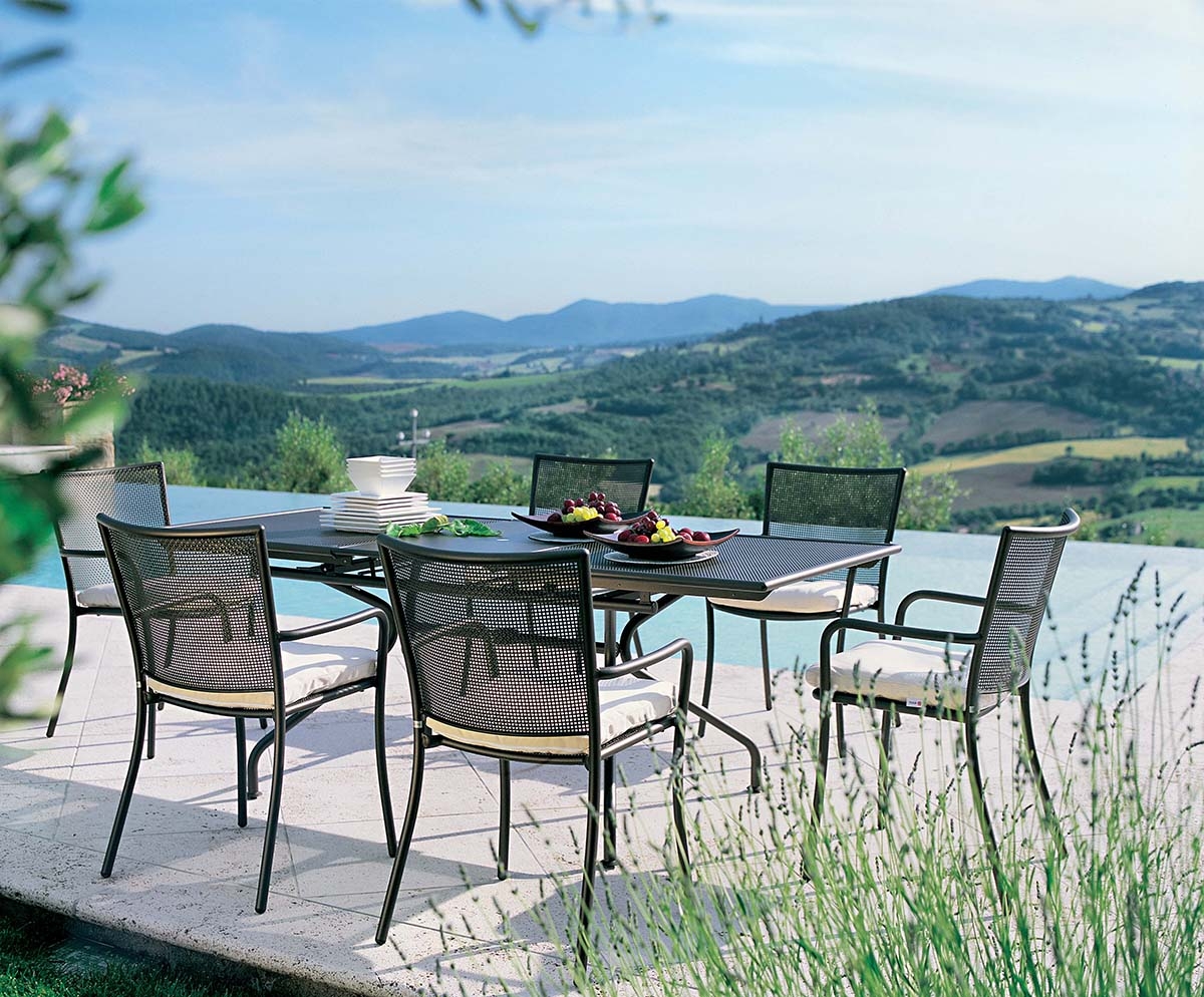 Kolekcija Athena iz jekla ima klasičen dizajn za prijazno in elegantno vzdušje. Tkana kovinska pločevina daje tej liniji pohištva eleganco in osebnost, ki jo sestavljajo stoli, mize in elementi za sprostitev na prostem.