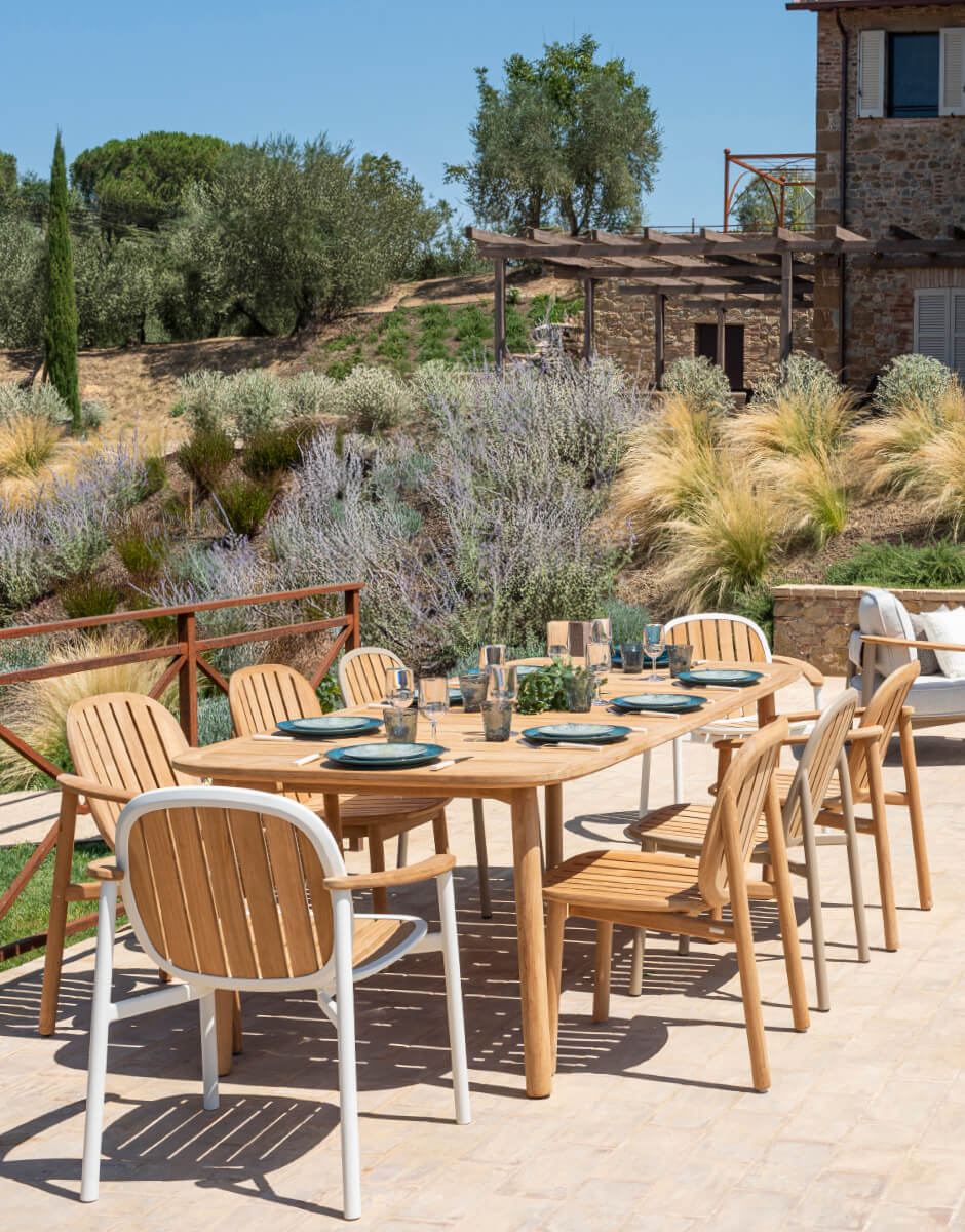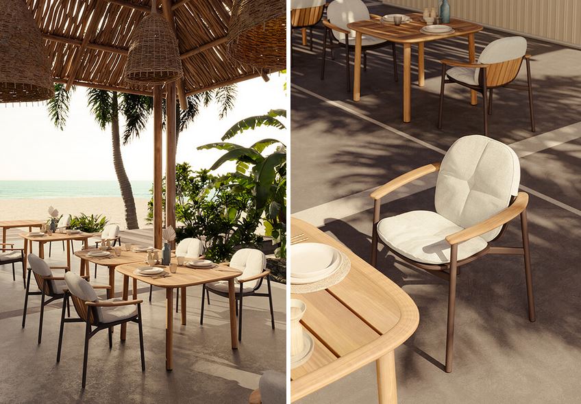 Kolekcija vrtnega pohištva Twins je sestavljena iz dveh različic: - ena je v celoti izdelana iz tikovine, druga pa z zanimivo mešanico materialov med tikovino in aluminijem, kar je popolna sinteza med izkušnjami oblikovalca in znanjem EMU. Kolekcija, sestavljena iz sedežev, miz in zofe, presega meje med zunanjim in notranjim prostorom. Njena edinstvenost omogoča najrazličnejše kombinacije ne le med obema različicama, temveč tudi z drugimi kolekcijami proizvajalca.