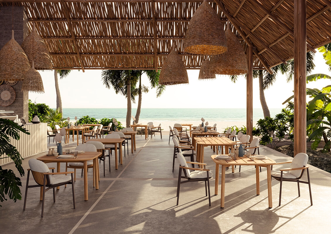 • Ogrodje: aluminijeve zlitine, ustrezno obdelane, da so odporne na vremenske vplive, in prašno barvane. Tik je trdi les z visoko vsebnostjo olja, primeren za zunanjo uporabo, brez potrebe po barvanju.